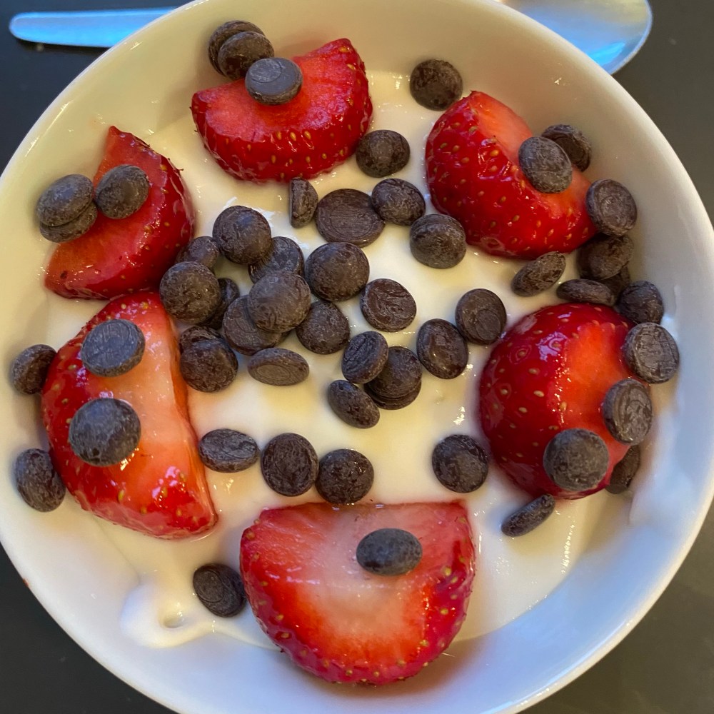 [Kurz darauf. GJ:] „Guck mal, mein Erdbeer-Joghurt-Schoko-Nachtisch – total gesund!“