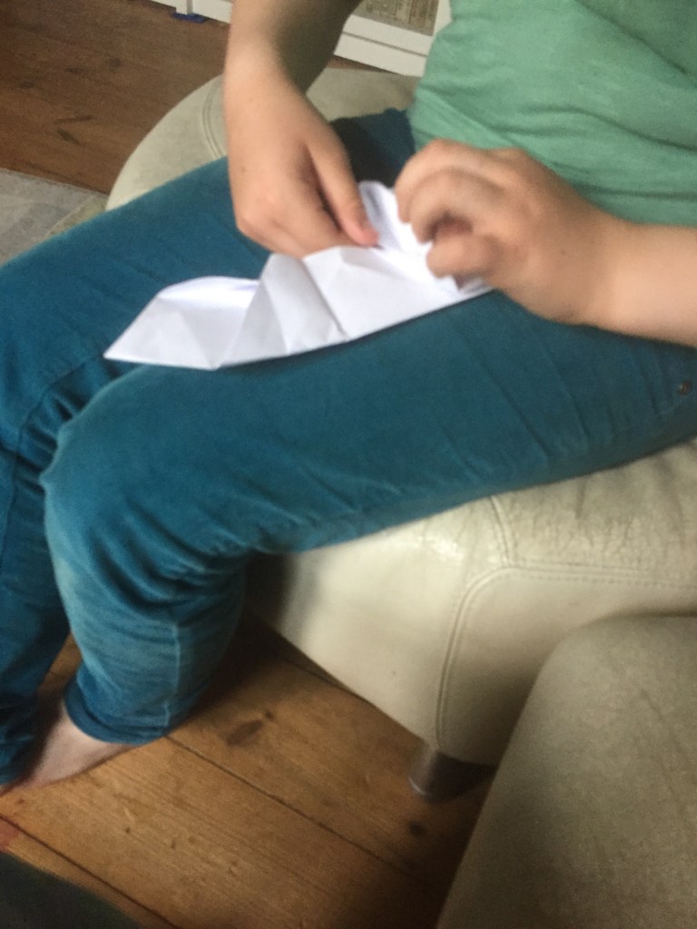 [KM:] “Guck mal, ich hab einen Geldbeutel gemacht aus Papier! Ein bisschen musste ich schneiden. Dann ist es nicht ganz echtes Origami.“