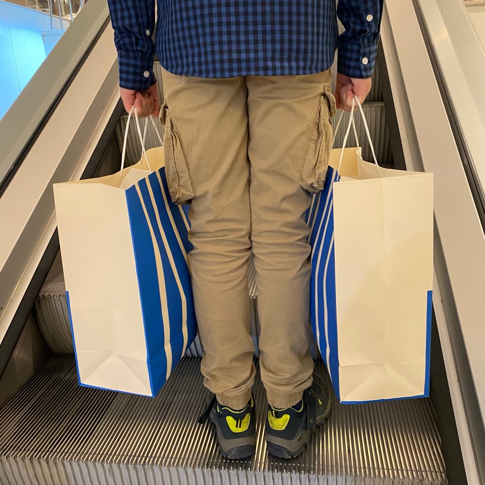 [GJ:] „Guck mal, mit den beiden Tüten sehe ich jetzt richtig aus wie ein Shopping-Girl! Ich dachte immer, dass Einkaufen doof ist, aber wenn man schöne Kleidung einkauft, macht das richtig Spaß!“
