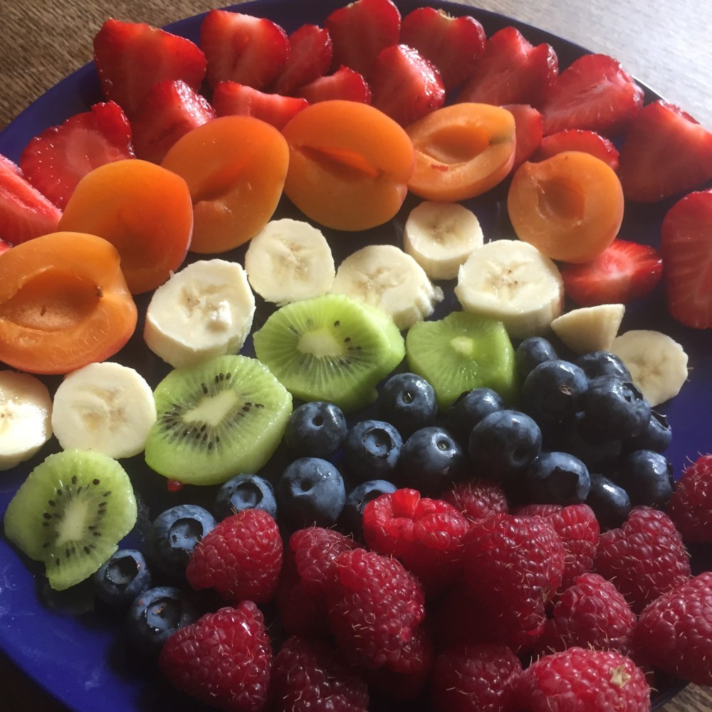 [KJ:] „Oooh, ein Regenbogen aus Obst. Den mag ich. Besonders das Blaue und das Rote.“
