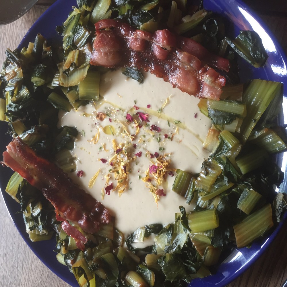 [folienstern:] „Das Rezept aus der Kiste – italienischer Löwenzahn mit Haferflockenbratlingen und Salat mit angebratenen Radieschen. Mal sehen, wer zuerst Iiih sagt.“
