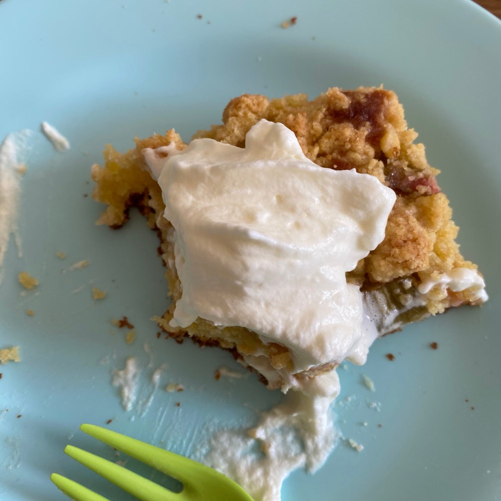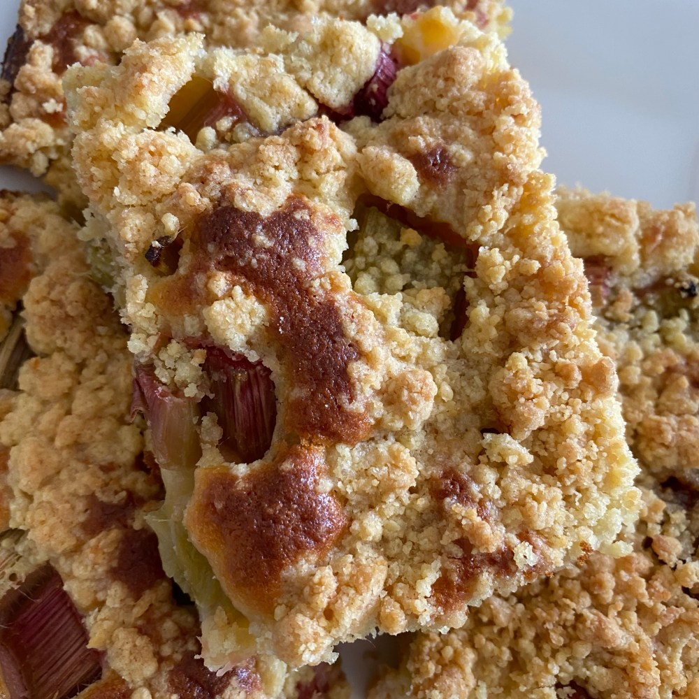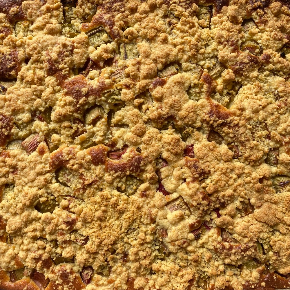 [kneteeis:] „Bäckst Du jetzt mit mir Rhabarber-Streuselkuchen? Da war Rhabarber in der Gemüsekiste.“