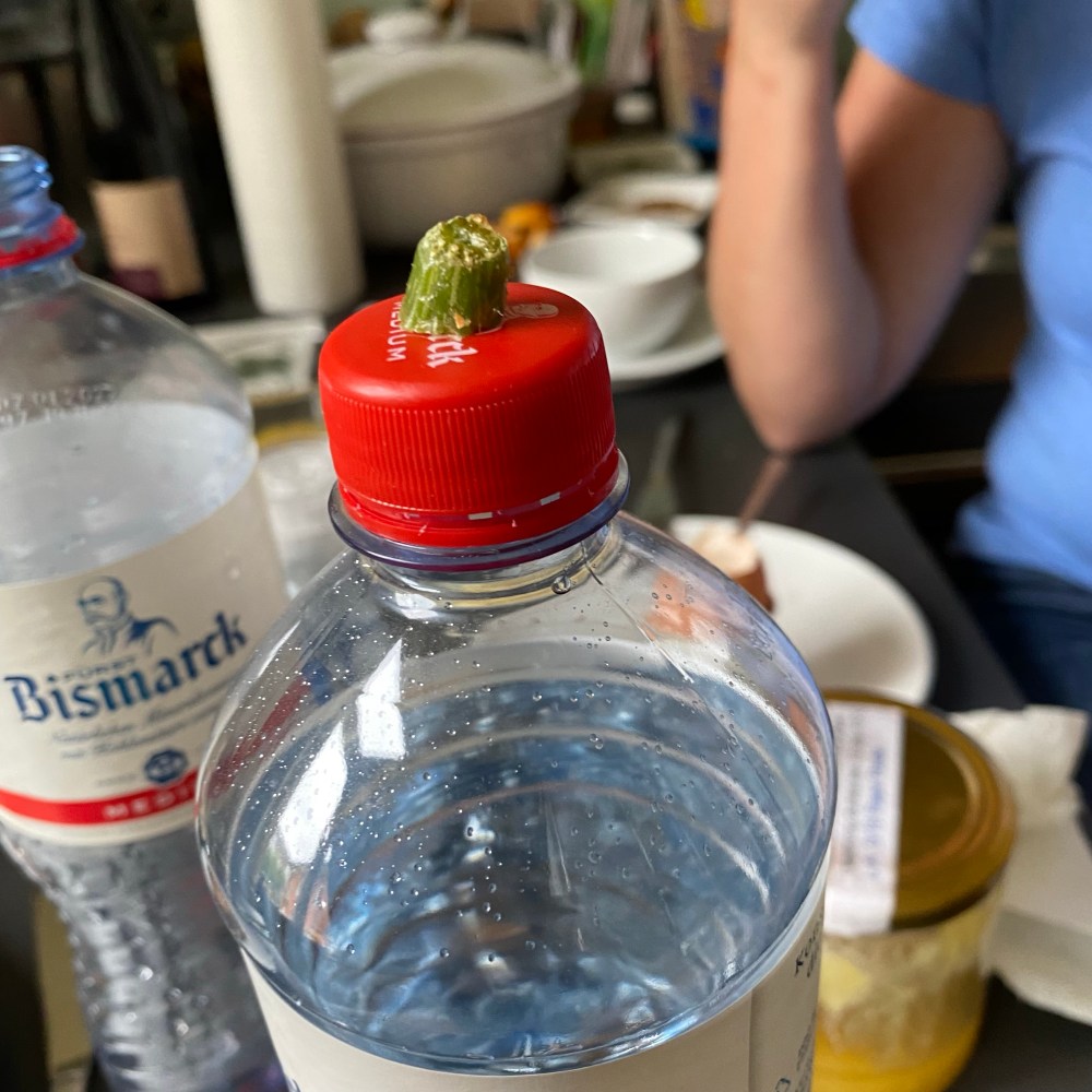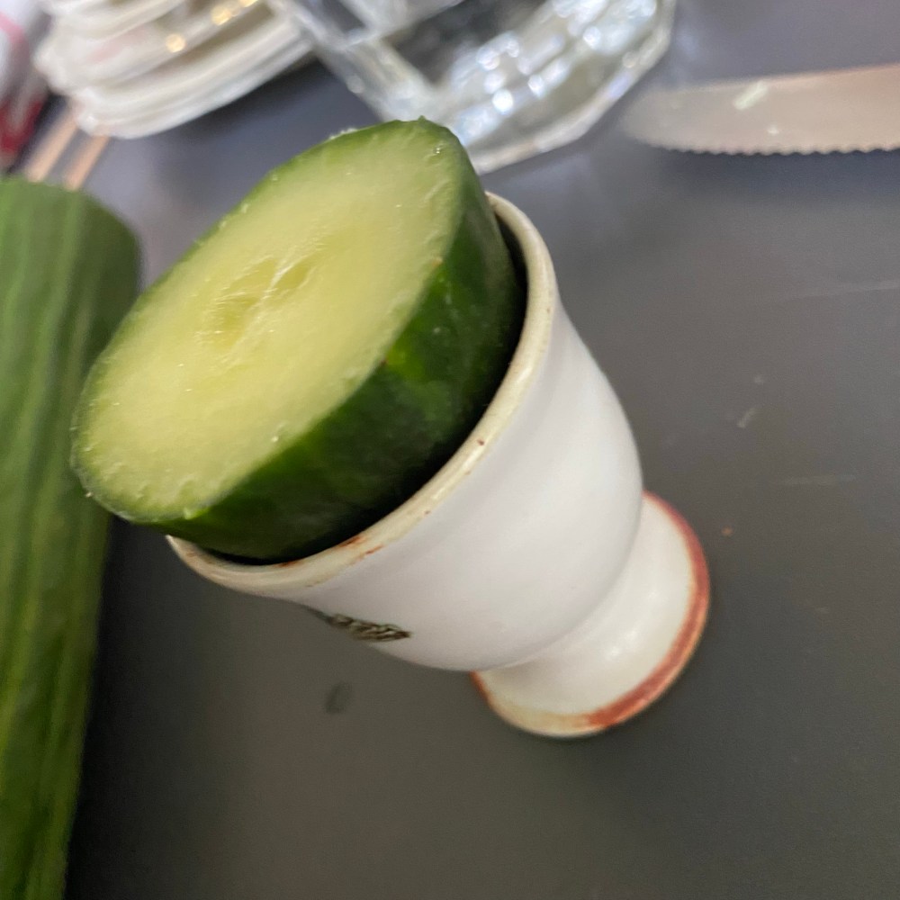 [GJ:] „Das ist ein Gurkenbecher. Und das ist König Wasserflasche mit der Gurkenkrone.“