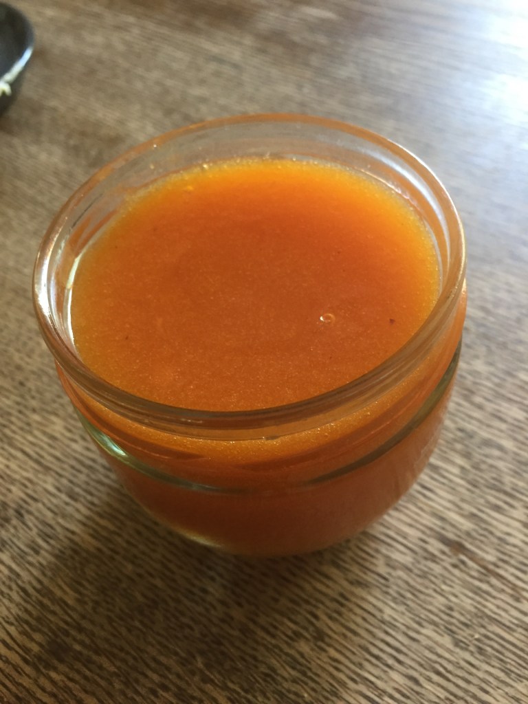 [folienstern:] „Aprikosenmarmelade. Du fandest die Aprikosen zu weich, da dachte ich, ich mach schnell Marmelade, ehe sie schlecht werden.“