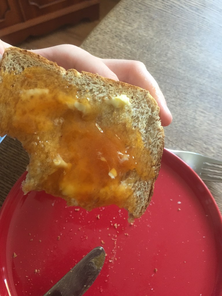 [KM:] „Toast mit hausgemachter Aprikosenmarmelade, bitte.“