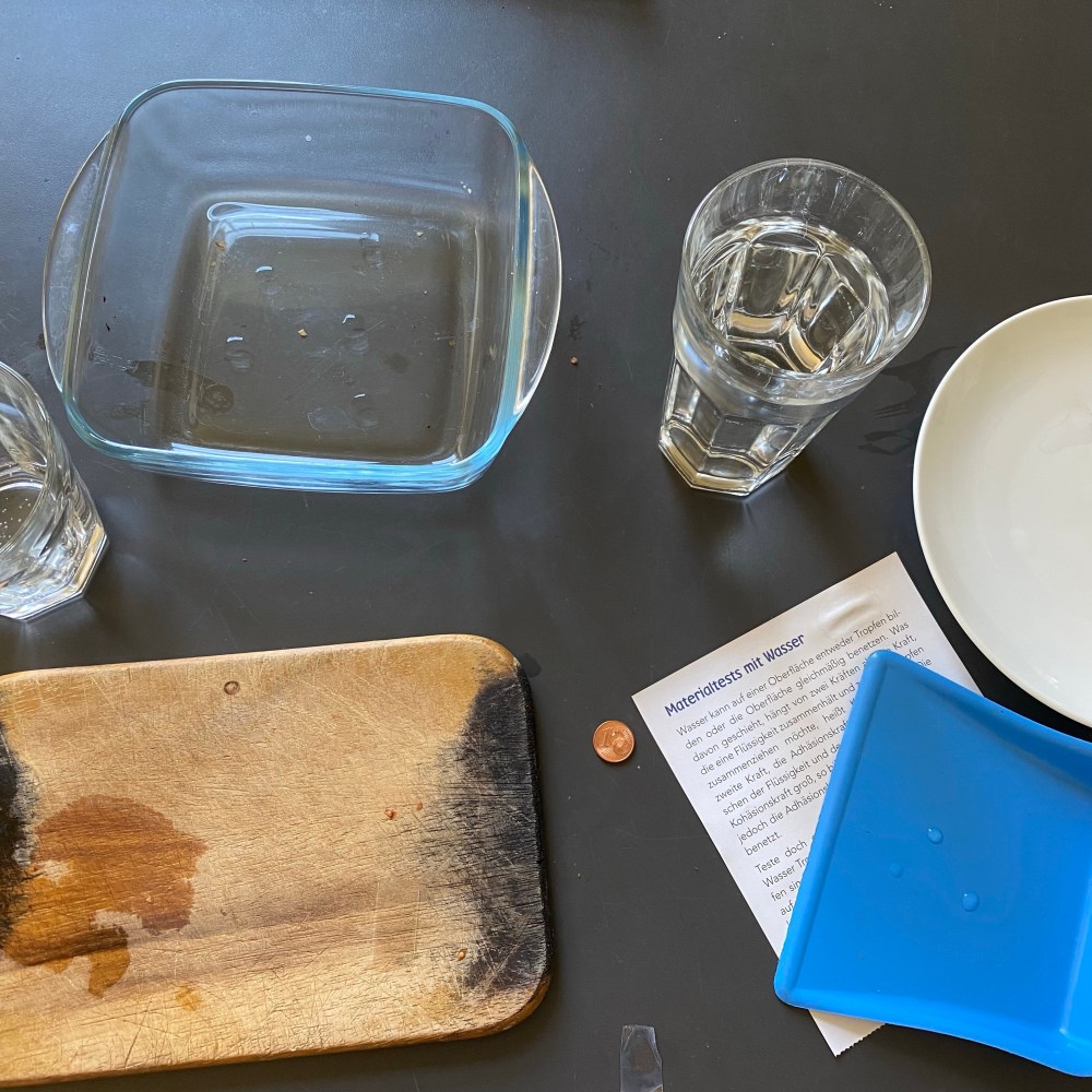 [GJ:] „Aus dem Kalender. Da sollte man probieren, auf welchen Oberflächen Wasser Tropfen bildet.“