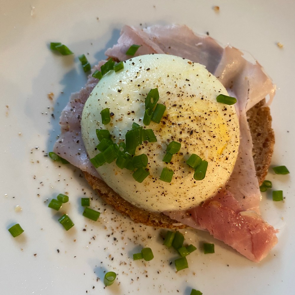 [folienstern:] „Gepoachtes Ei mit Toast, bitte.“