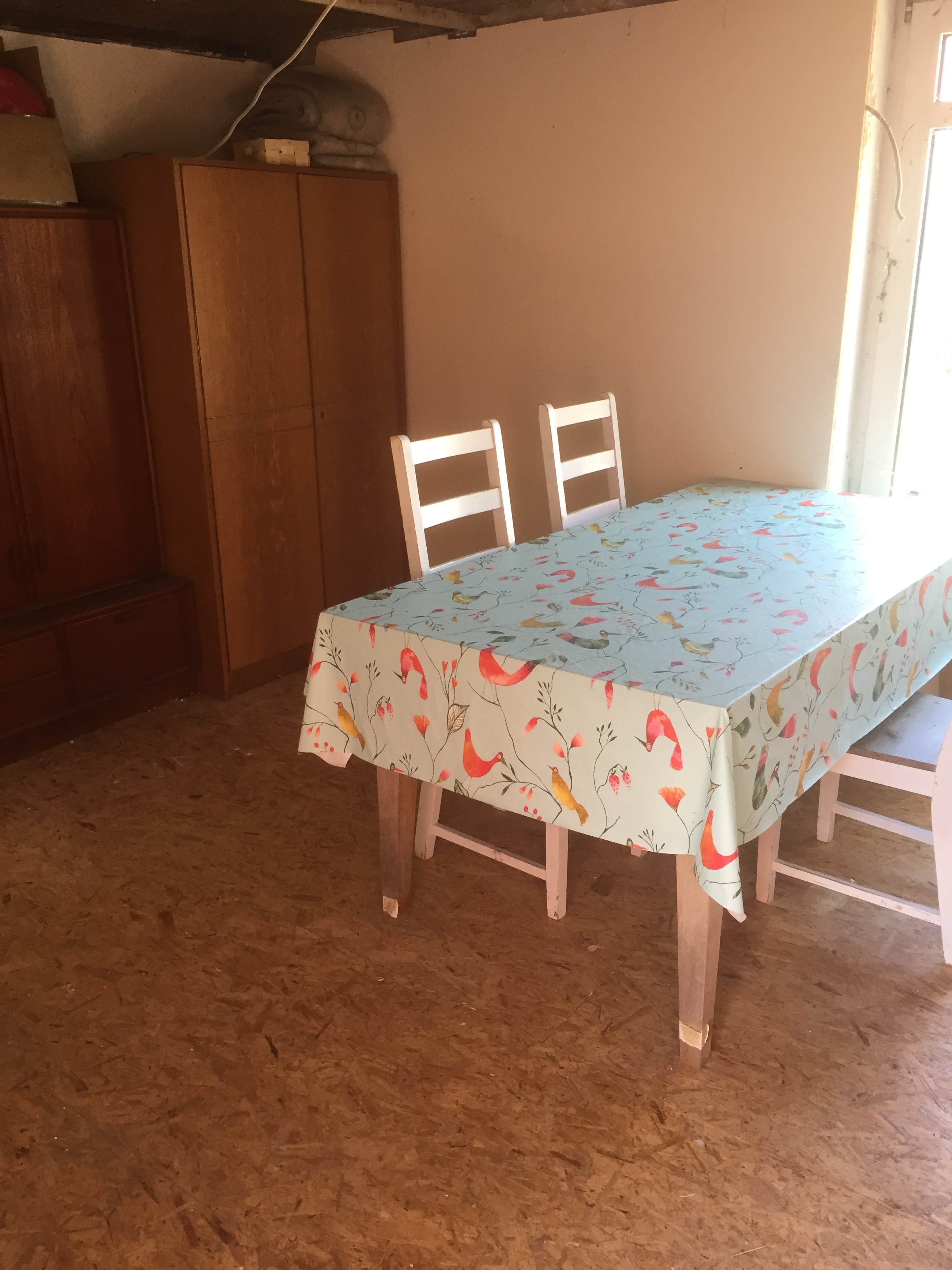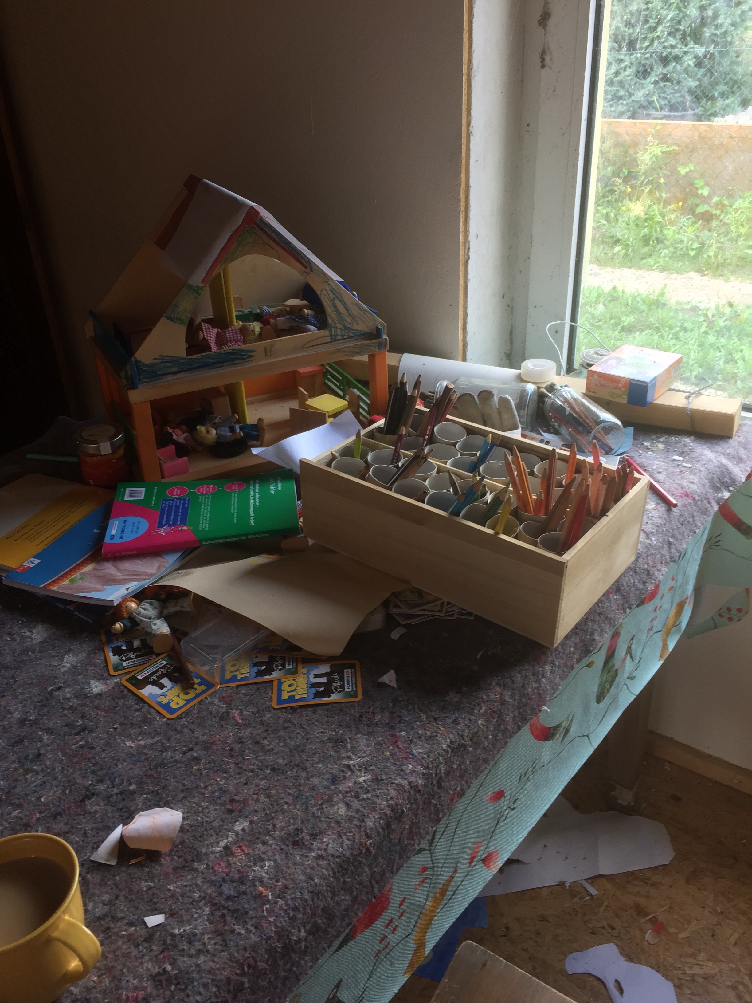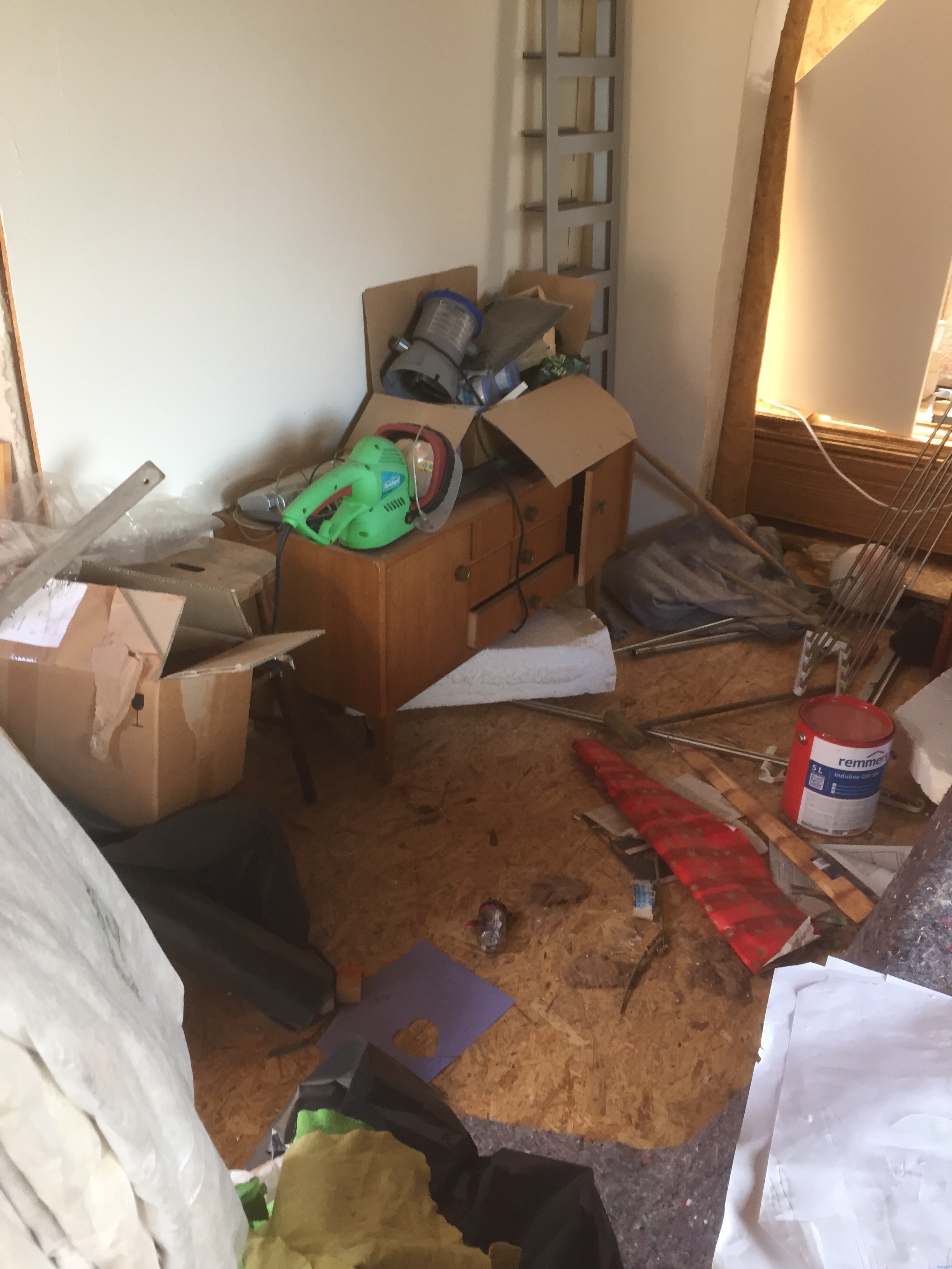 [folienstern:] „Petterson-Kette – wenn ich die Sachen aus dem Anbau räumen will, muss ich die Sachen von der Treppe räumen, aber damit ich die wegräumen kann, muss ich erst das Atelier aufräumen. Da haben da kleine Mädchen und die Nachbarsjungs bei Regen gespielt.“