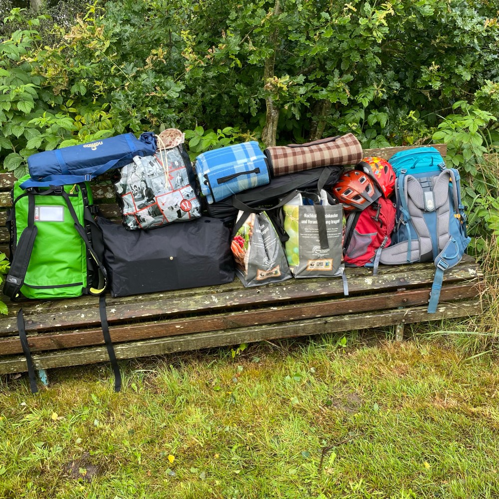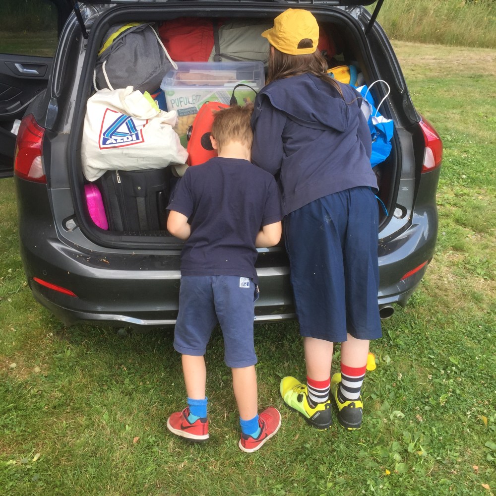 [Etwas später. folienstern:] „Die Packbank ist fast leer. Noch die letzten Sachen rein, und dann müsst Ihr etwas quetschen, Kinder!“