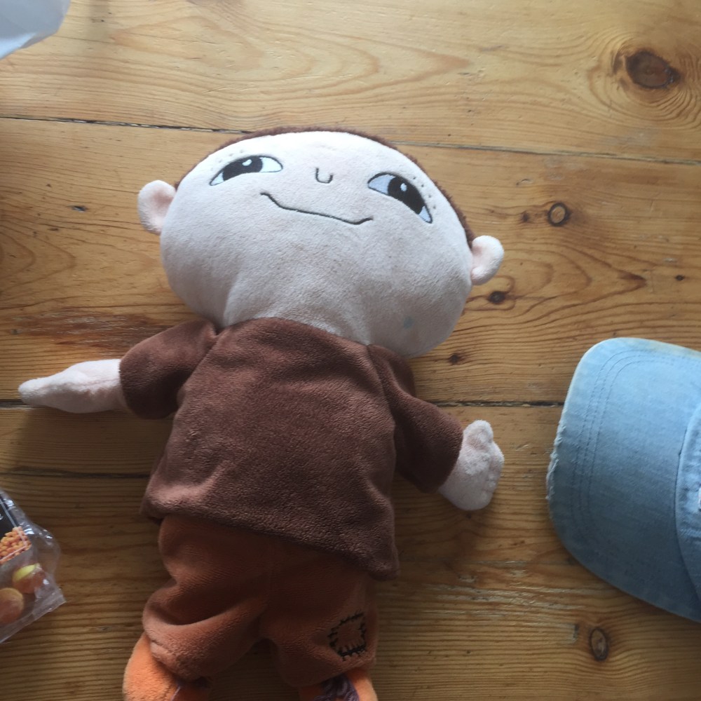 [KJ:] „Guck mal, das große und das kleine Mädchen haben mir ihre Kuscheltiere geliehen! Zum Kuscheln. Und ich darf sie nennen, wie ich will!“