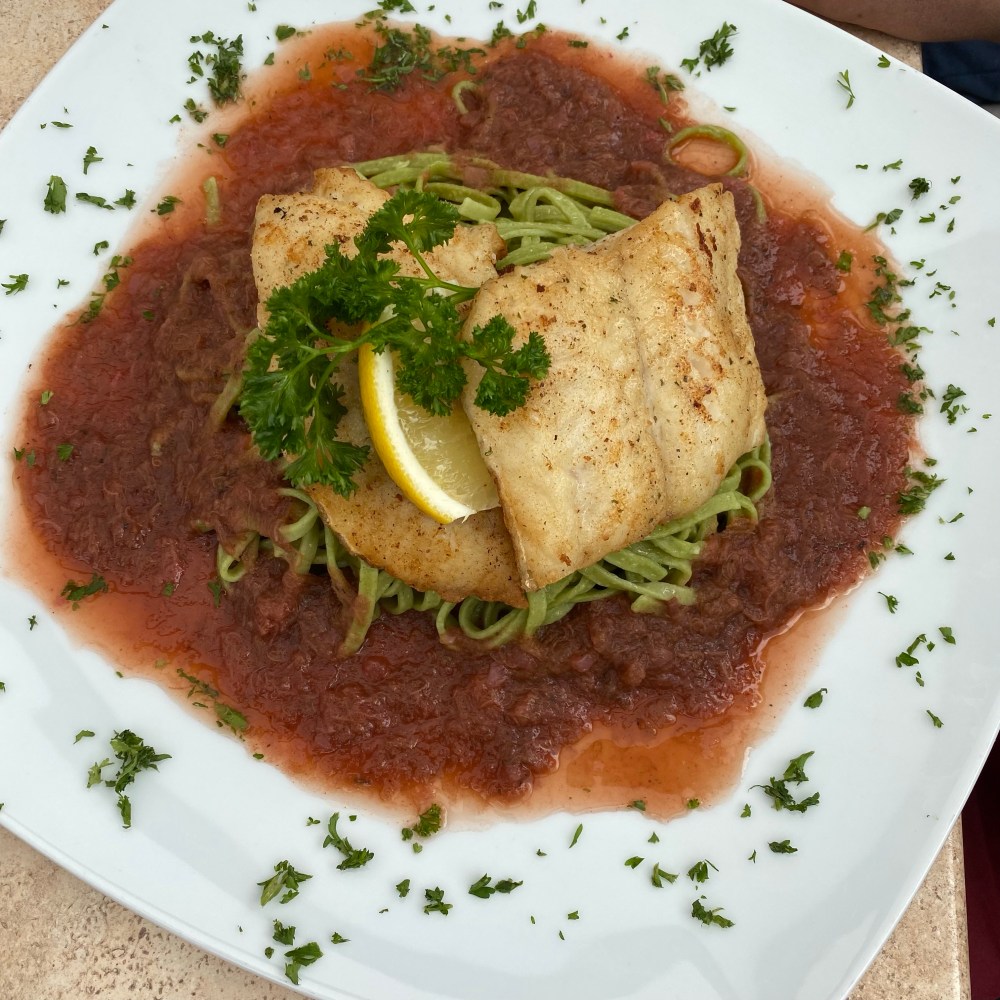 [Kellner:] „Echt? Wow. Das gibt es nicht so oft, das Kinder den Fisch nehmen! Das mit den Gräten ist ja selbst den Erwachsenen oft zu mühsam! Wenn Ihr den aufesst, spendiere ich Euch ein Eis!“