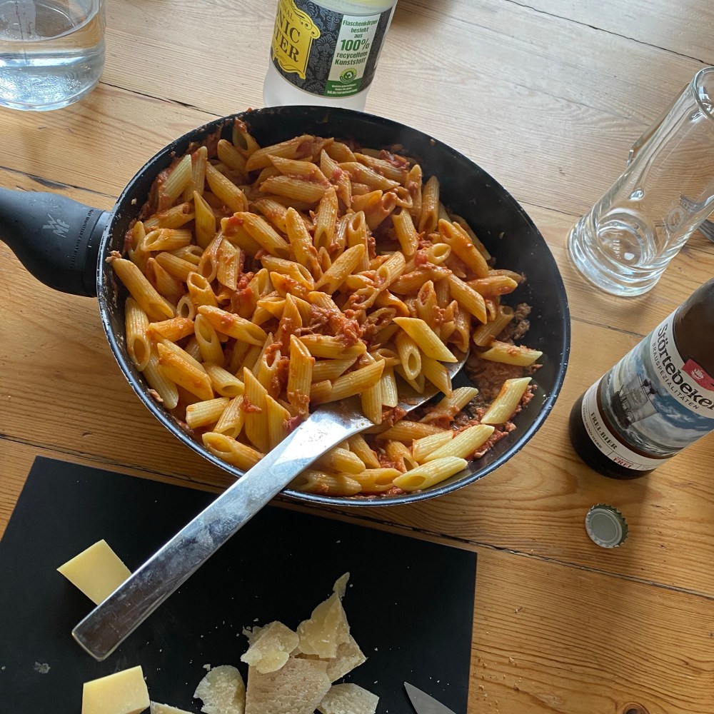 [GJ:] „Ich koche jetzt noch Abendesse. Ich mache Nudeln mit Thunfisch und Tomaten, und Du darfst erst wieder in die Küche kommen, wenn ich rufe.“