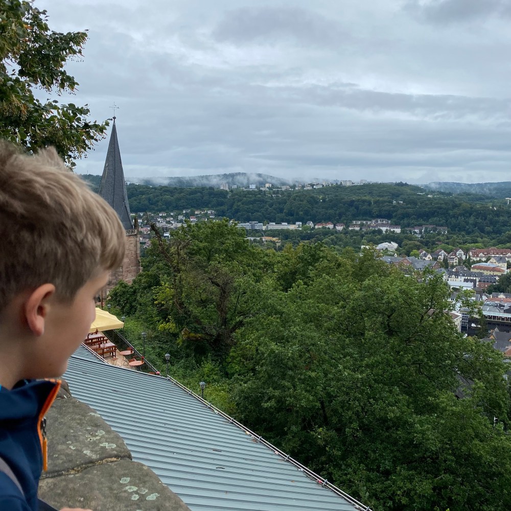 [GJ:] „Bis 11:30 soll es nicht regnen. Da können wir vom Schloss runter zum Bahnhof laufen und noch ein paar von den schönen Gassen angucken!“