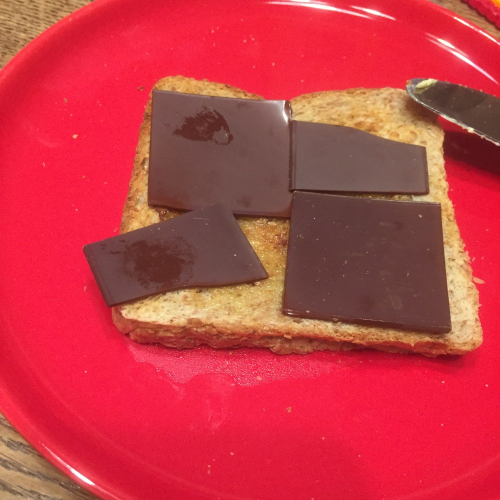 [folienstern:] „Danke schön! Mhm, guckt mal, ich habe von Oma so Schokotäfelchen bekommen. Die esse ich jetzt auf Toast!“