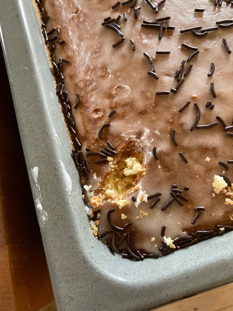 [folienstern:] „Grmpf. Das sollte der Geburtstagskuchen für Papa sein. Und wir wollten davon morgen was mitnehmen zu der anderen Geburtstagsfeier. Dann müssen wir das wohl aufschneiden und das Stück hierlassen …“