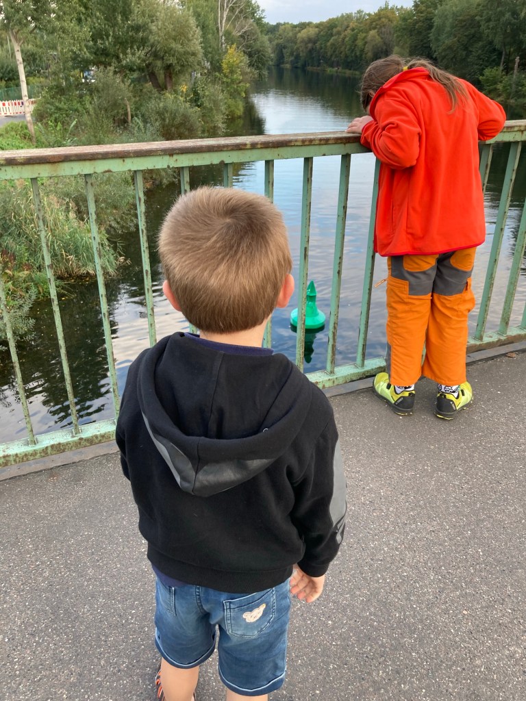 [KM:] „Die bauen eine neue Brücke. Aber noch können wir über die alte gehen. Oh, guck mal – auf dem Kanal ist eine mit Kanu und ganz viel Gepäck!“