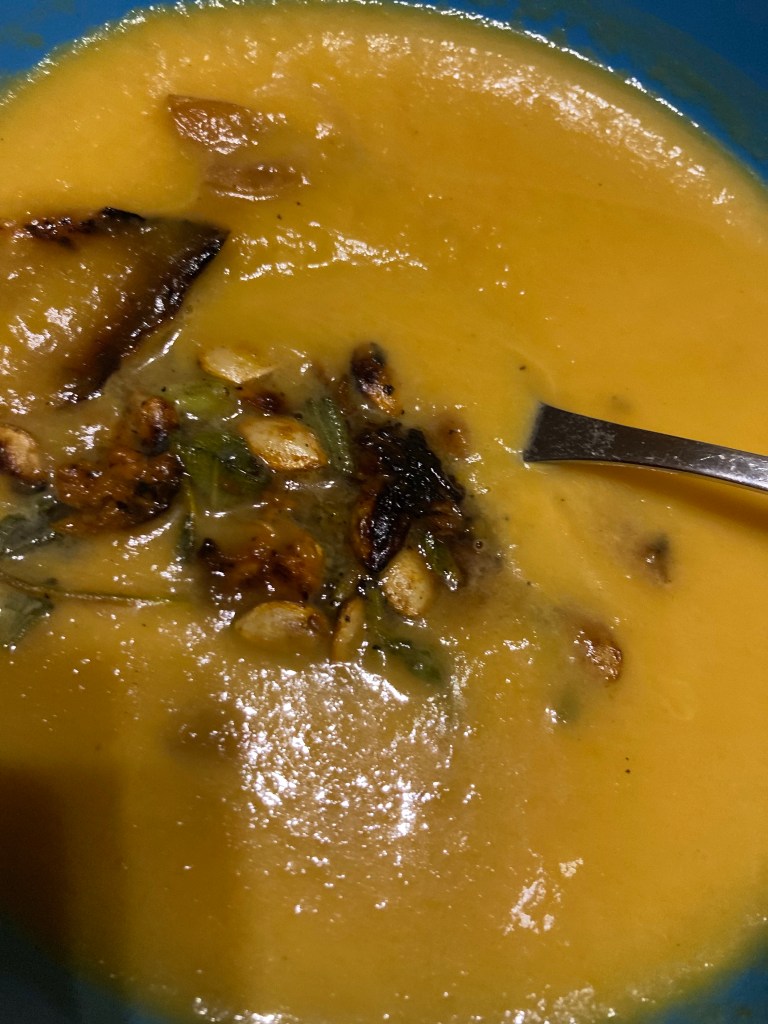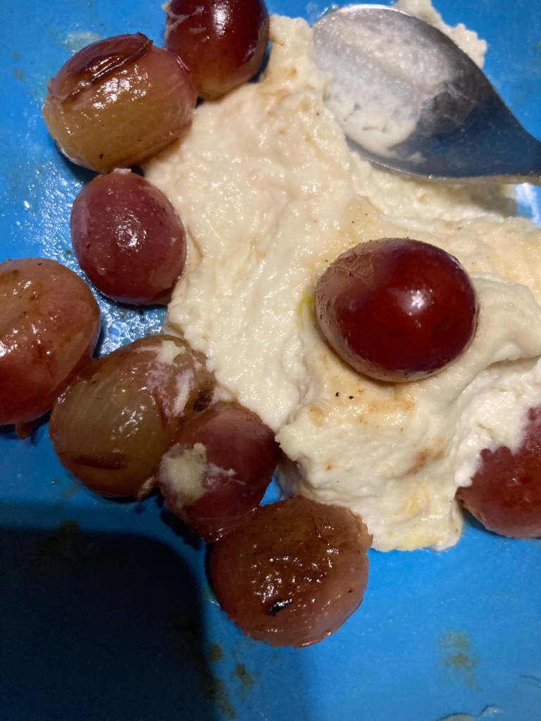 [KM:] „Hm – also die Suppe ist okay. Das drauf nicht so, die Kerne und so. Aber das ist ja nicht Deine Schuld, Du hast ja nur das Rezept aus der Box gekocht. Da waren dann halt die Zutaten nicht so meins. Und die Weintrauben sind lecker, aber die Creme schmeckt mir nur mit Honig.“