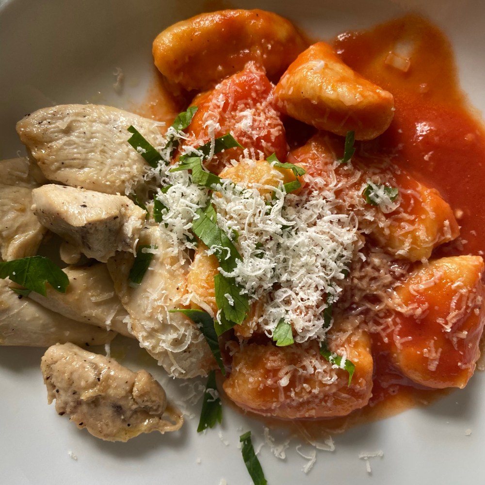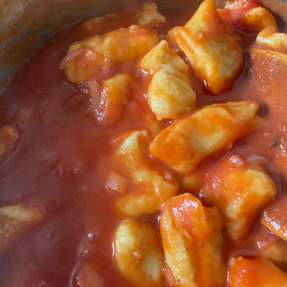 [kneteeis:] „Ich mache jetzt mal etwas Warmes zu essen, ja? Du warst ja mittags nicht da, und nachher gehen wir in die Oper. Was hältst Du davon, wenn ich die Gnocchi vom letzten Wochenende mit Tomatensauce mache?“