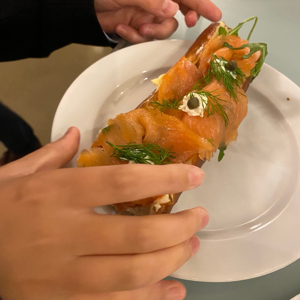 [GJ:] „Und es gibt wieder Lachsbrötchen in der Pause!“