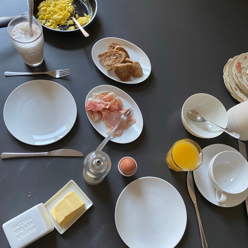 [kneteeis:] „Ich nehme ein gekochtes Ei. Und Schinken und einen Orangensaft.“