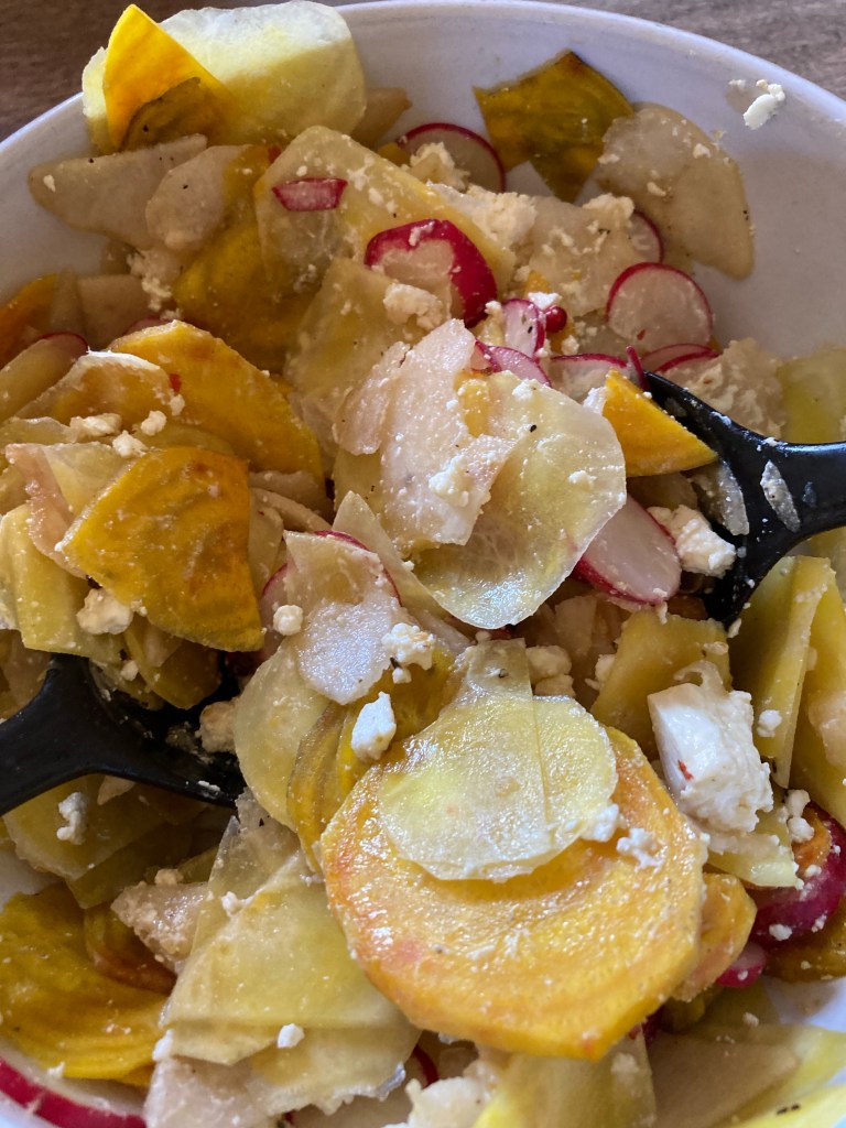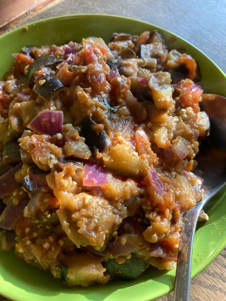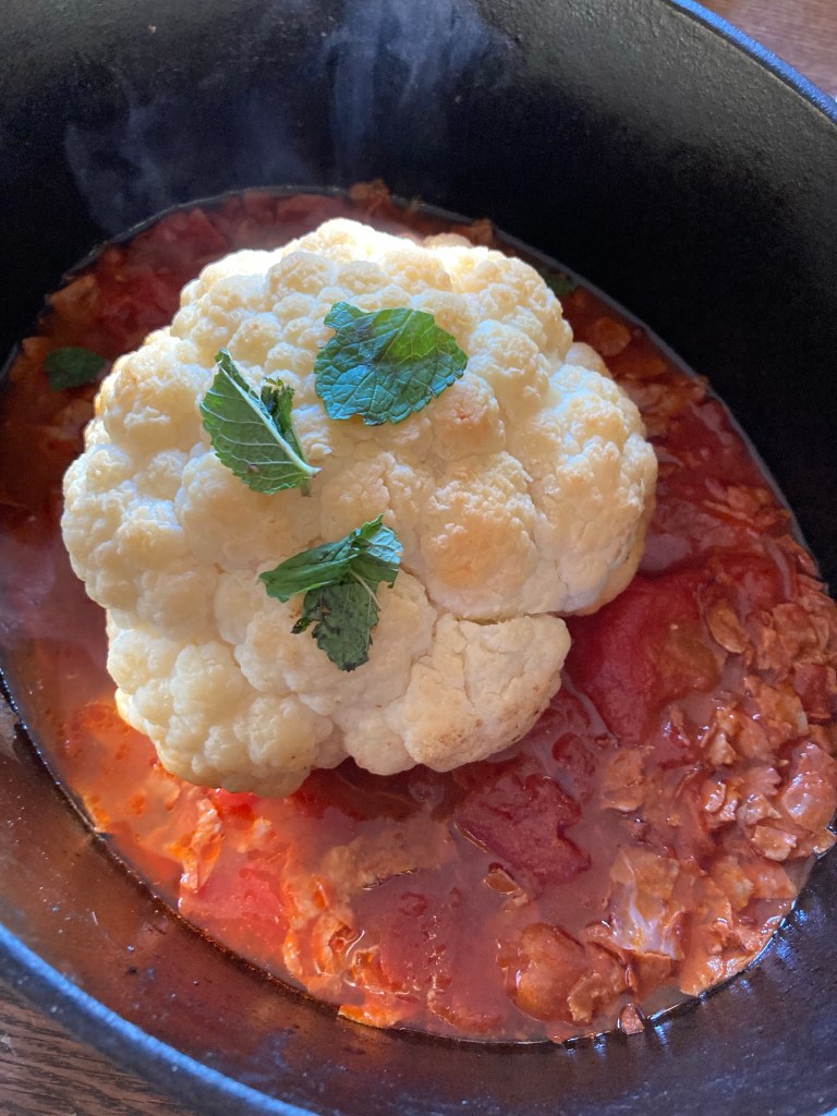 [folienstern:] „Blumenkohl mit Chorizo und Aubergine mit Tomate und Salat.“