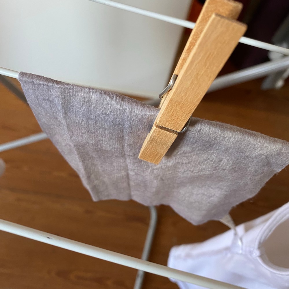 [kneteeis:] „Haha, Du hast ja gestern das Schmutzfangtuch auch mit auf den Wäscheständer gehängt! Das hatte ich gar nicht gesehen!“