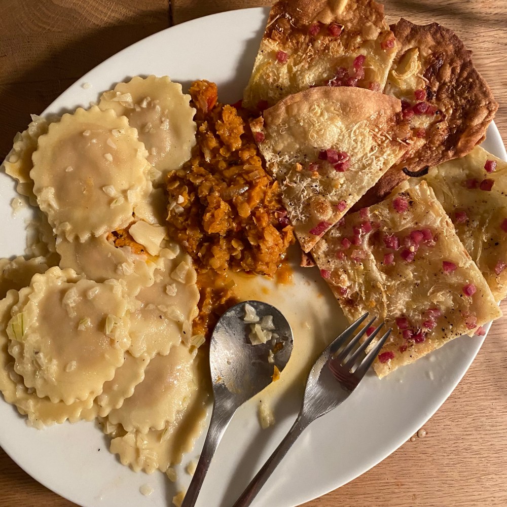 [kneteeis:] „Okay, dann mache ich Euch etwas zu essen. Es gibt internationale Resteplatte mit Elsässer Flammkuchen, indischem Linsengemüse und italienischen Ravioli.“