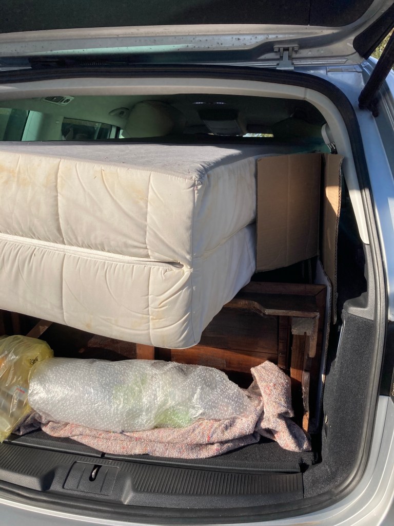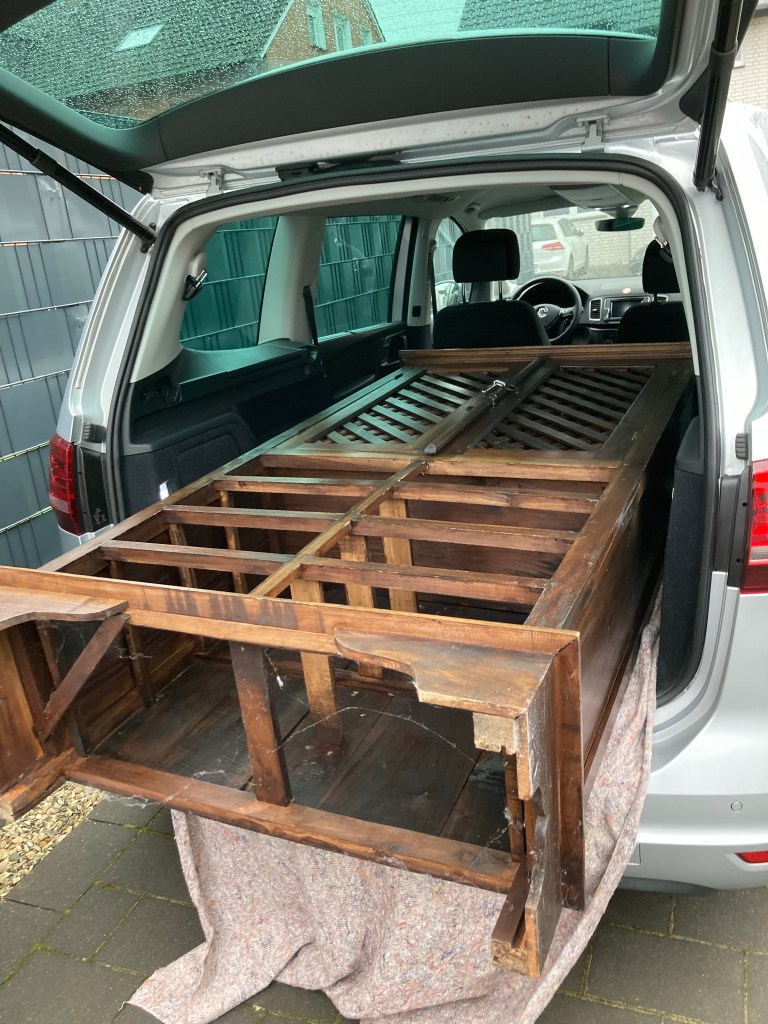 [Vater:] „Also, das Auto ist ja doch viel größer als erwartet. Ich glaube, da kriegen wir auch noch das Sofa rein, wenn wir den Schrank zuerst reintun!“
