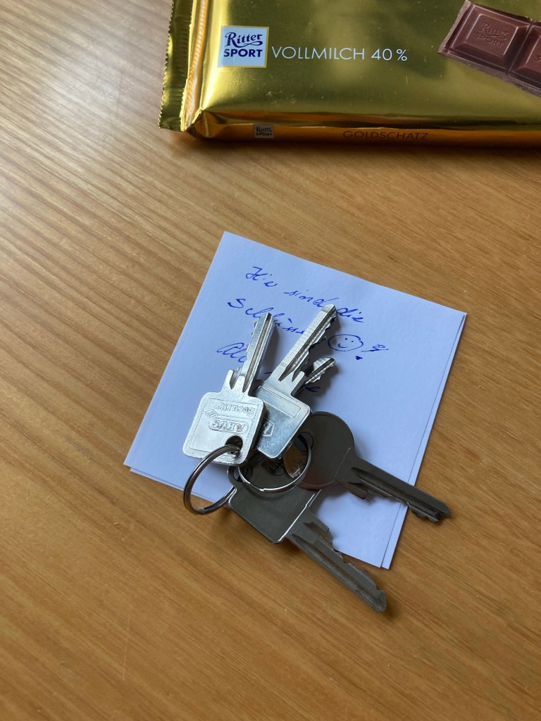 [Samstagnachmittag. folienstern:] „Alles eingepackt. Dann lasse ich jetzt den Schlüssel auf dem Tisch liegen & wir können los.“