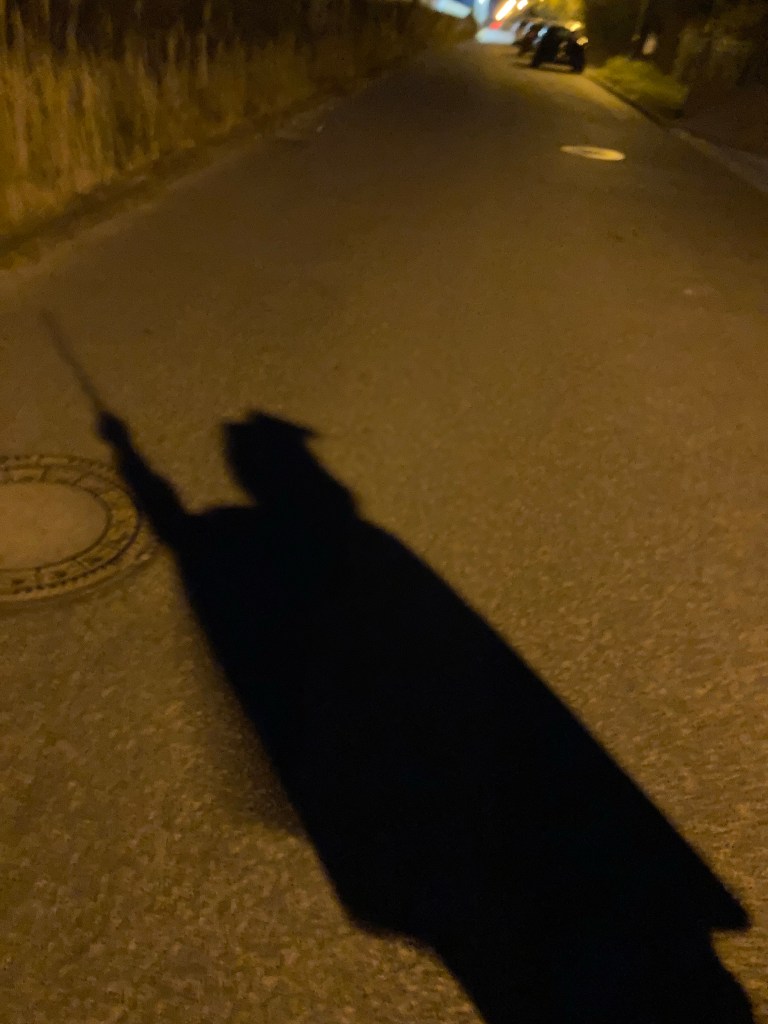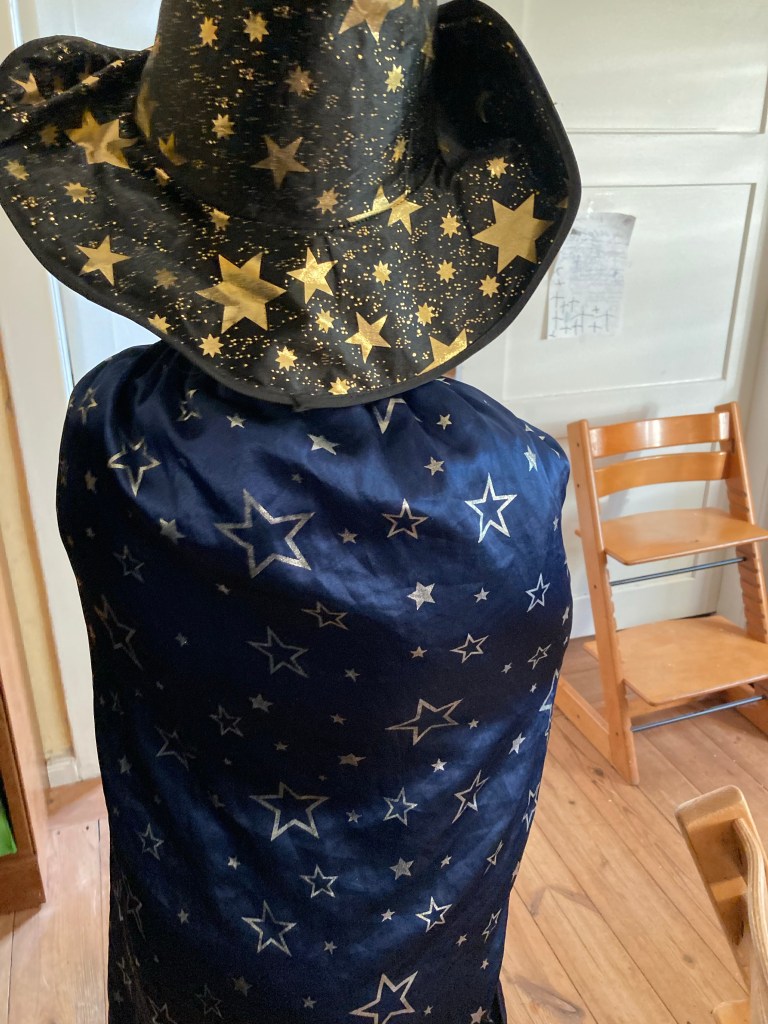 [KM:] „Guck mal, ich habe schon mein Kostüm zusammengesucht! So ein olles Hemd und die Ritterhose und den Umhang und den Hut.“