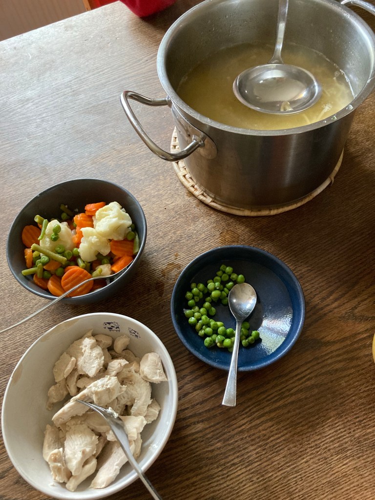 [folienstern:] „Hühnersuppe zum Selbermachen. Und dann Frangipane.“