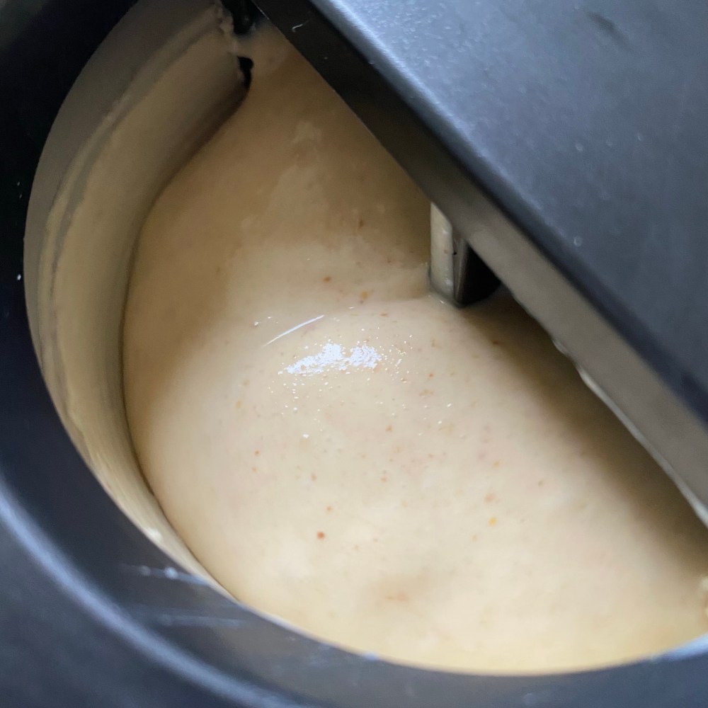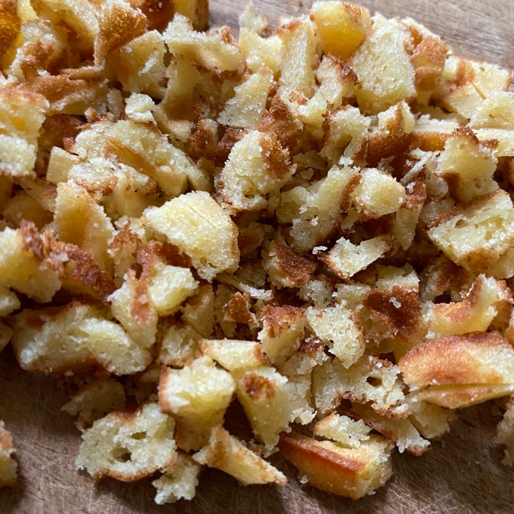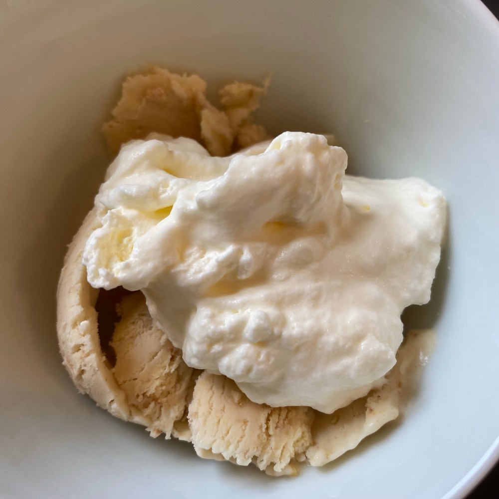 [kneteeis:] „Ich denke, einen Teil der Waffeln tun wir in die Eismasse, und den anderen Teil mischen wir in kleinen Stückchen unter.“