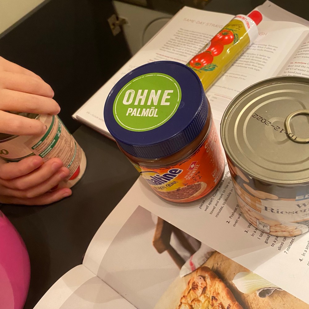 [GJ:] „Ja, gerne! Ich nehme schon mal alles raus: Weiße Bohnen, Ovomaltine, Tomaten, Tomatenmark…“