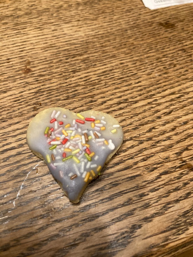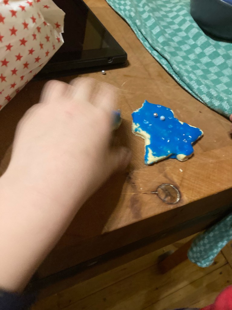 [KM:] „Hallo Mama! Gleich gehen wir wieder rüber, wir haben nämlich gestern Plätzchen gebacken, und heute dürfen wir verzieren!“