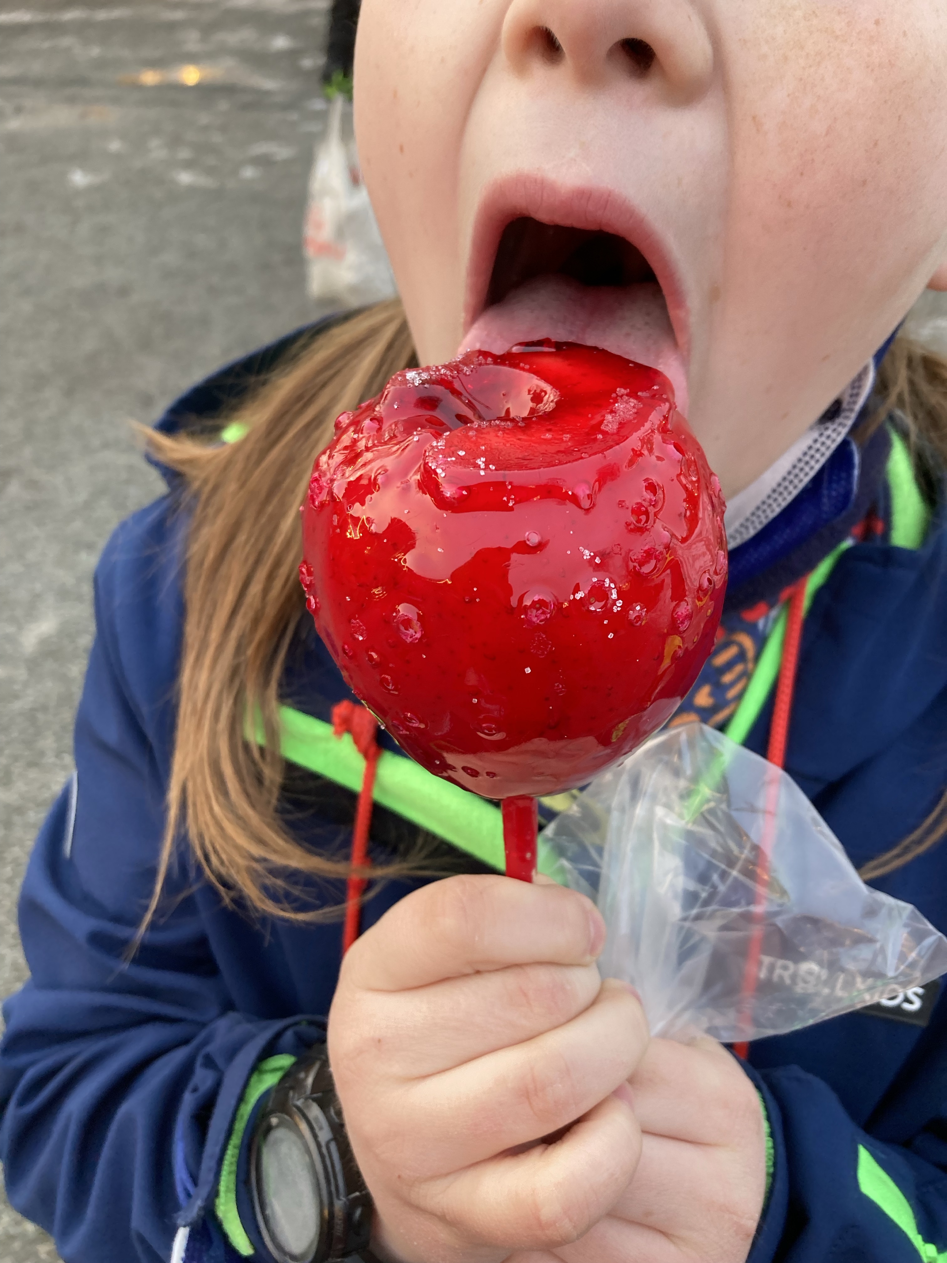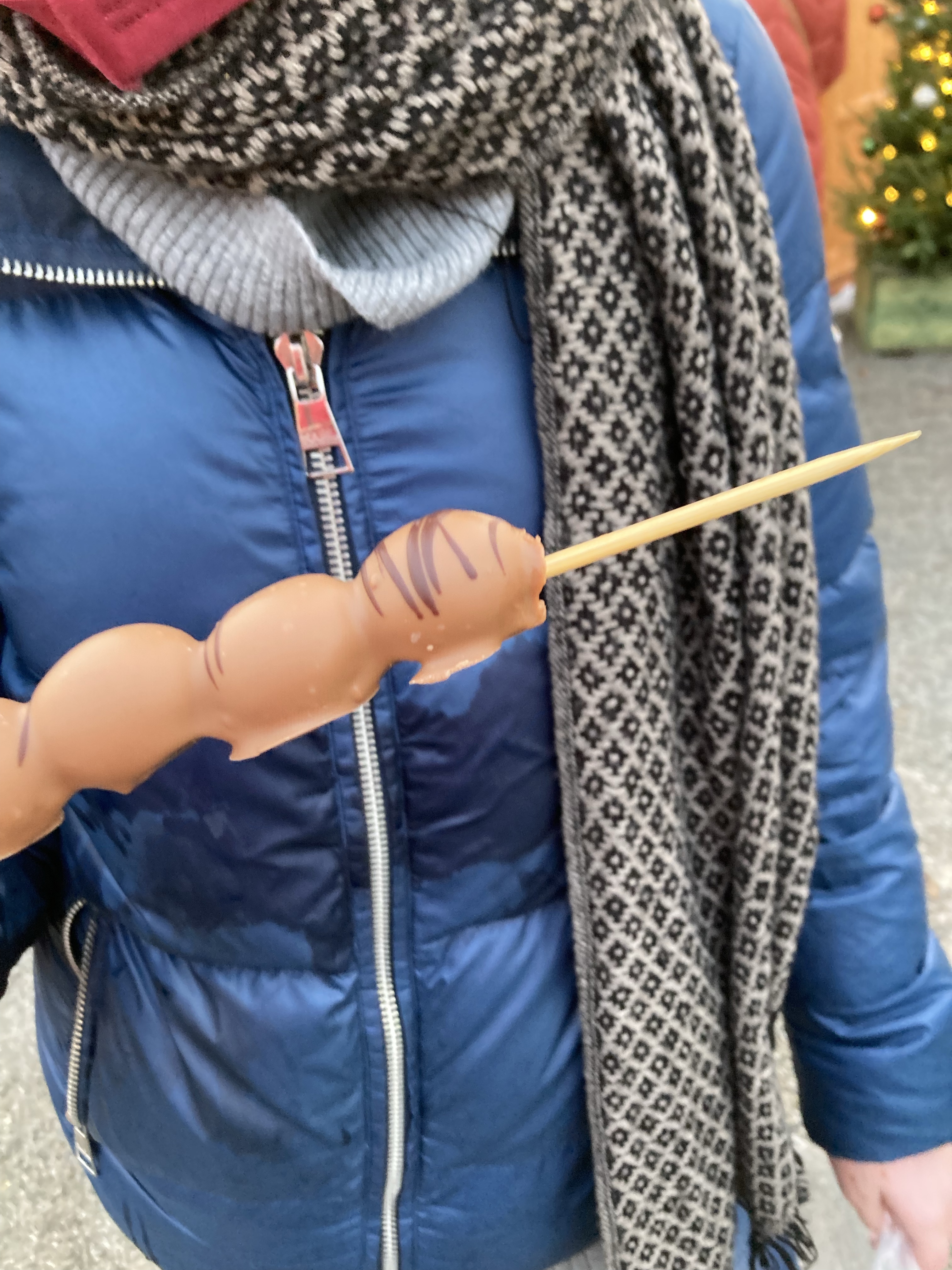 [Etwas später auf dem Weihnachtsmarkt. KM:] „Ich möchte einen kandierten apfel.“
