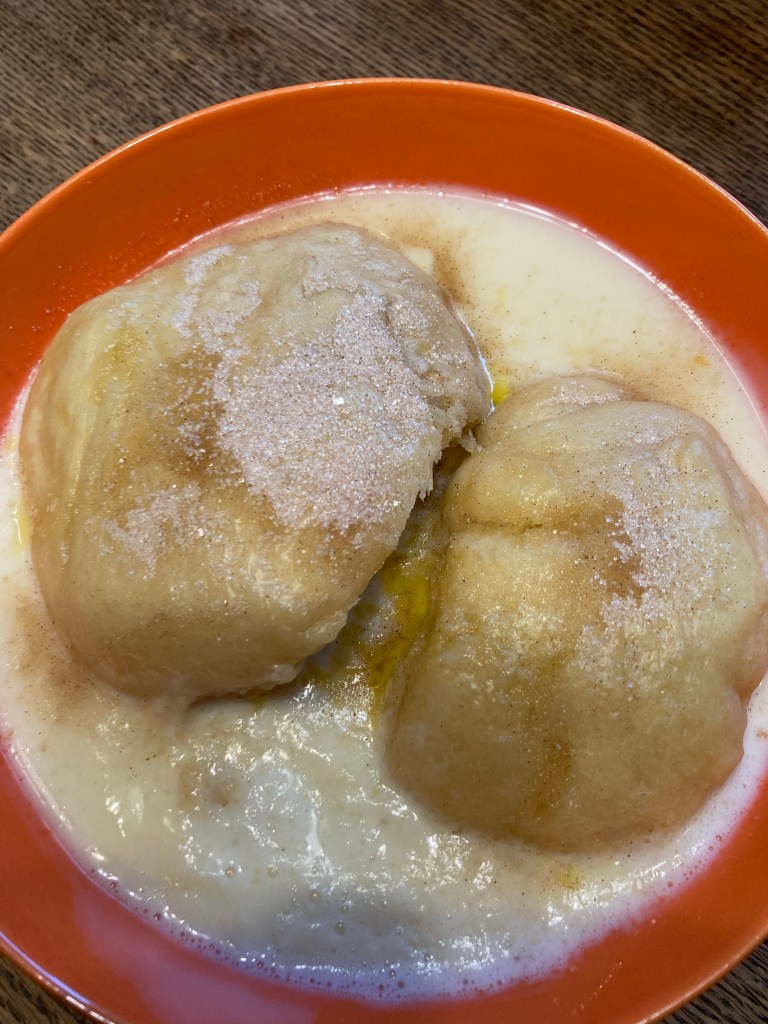 [folienstern:] „Nudelsuppe und dann Dampfnudeln. Die sind ganz gut geworden, trotz viel weniger Hefe.“
