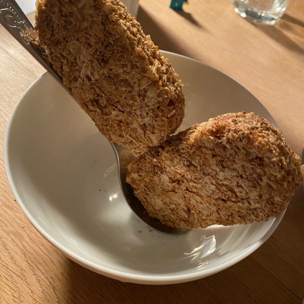 [GJ:] „Ich probiere mal… Hm, die Kartoffeln sind schon mal lecker. Aber der Rosenkohl hat nicht geschmeckt.“