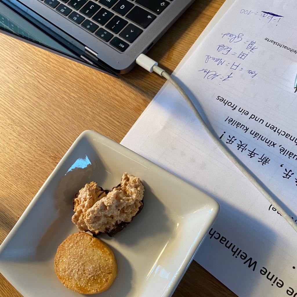 [Kurz darauf. GJ:] „Englisch ist fertig. Gerade rechtzeitig für Chinesisch! Bringst Du mir noch Kekse?“