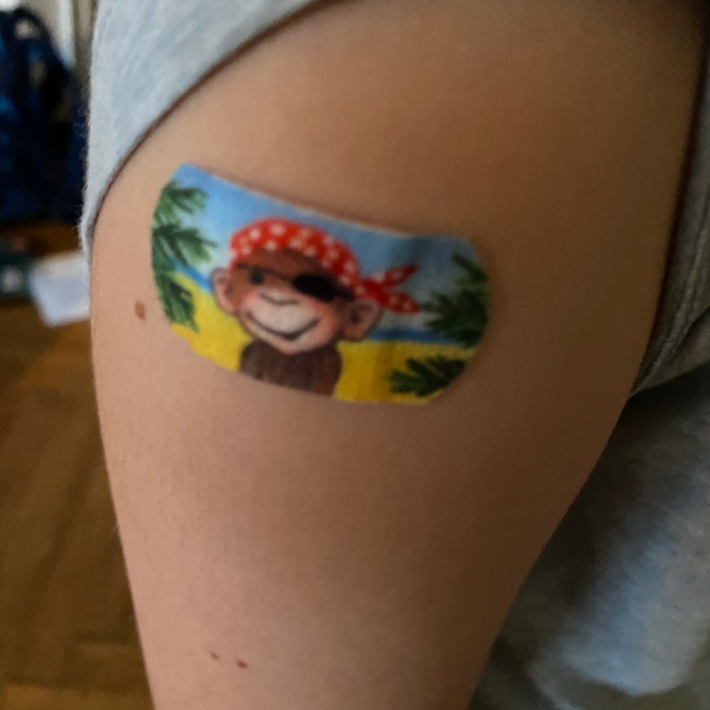 [GJ:] „Klar! Dann sehen alle, was es bei der Impfung für coole Pflaster gab. Ich habe extra den Affen genommen. Den Totenkopf fand ich doof und den Hund langweilig.“
