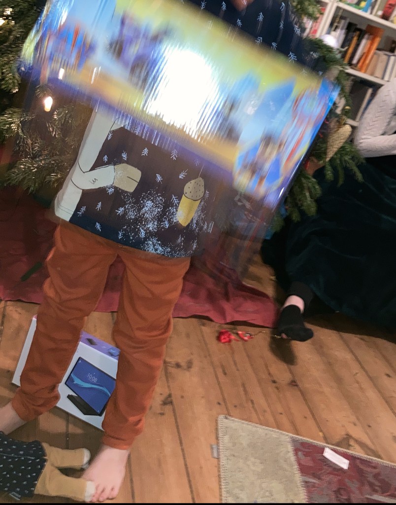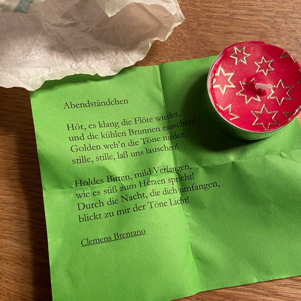 [Opi:] „Ihr könnt mal gucken, ob da vorne noch die Kiste steht, aus der sich Nachbarn ein Weihnachtsgeschenk nehmen dürfen. Ich bin da vorhin vorbei gekommen, aber da ich hier nicht wohne, habe ich nichts rausgenommen.“
