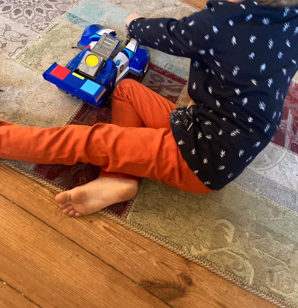 [KJ:] „Ich mag meine Geschenke! Besonders das Dieb-Auto und das Chase-Auto. Und mein neues Outfit, das Puppi auch hat. Und das leuchtet.“