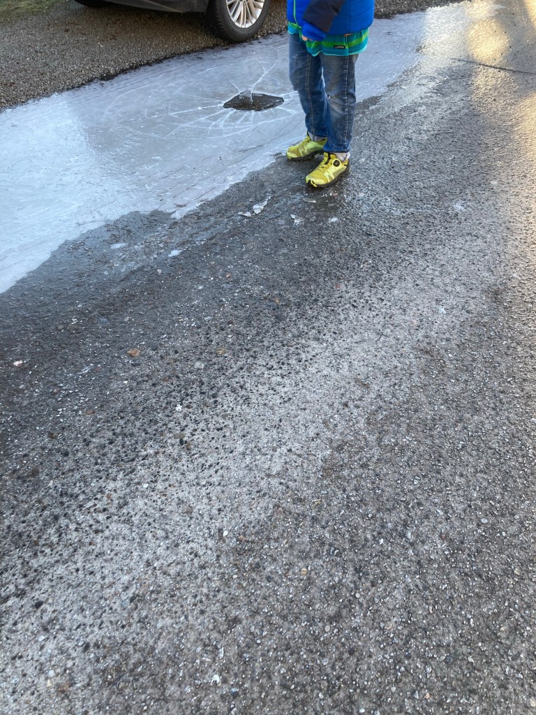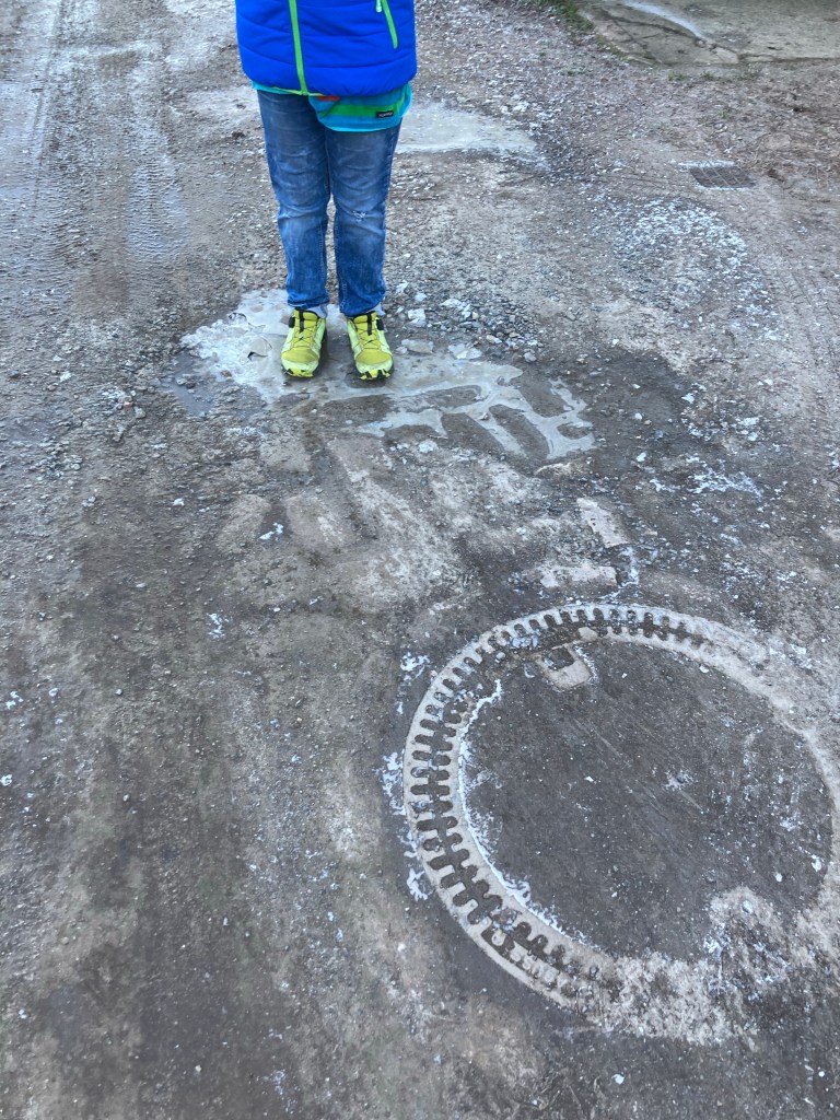 [Etwas später. KM:] „Guck mal! Man kann schlittern auf dem Eis!“