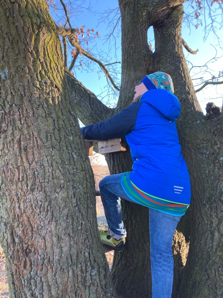 [Noch etwas später. KM:] „Das ist ja gar kein Baumhaus! Das sind Plattformen! Ich Kletter trotzdem mal hoch.“