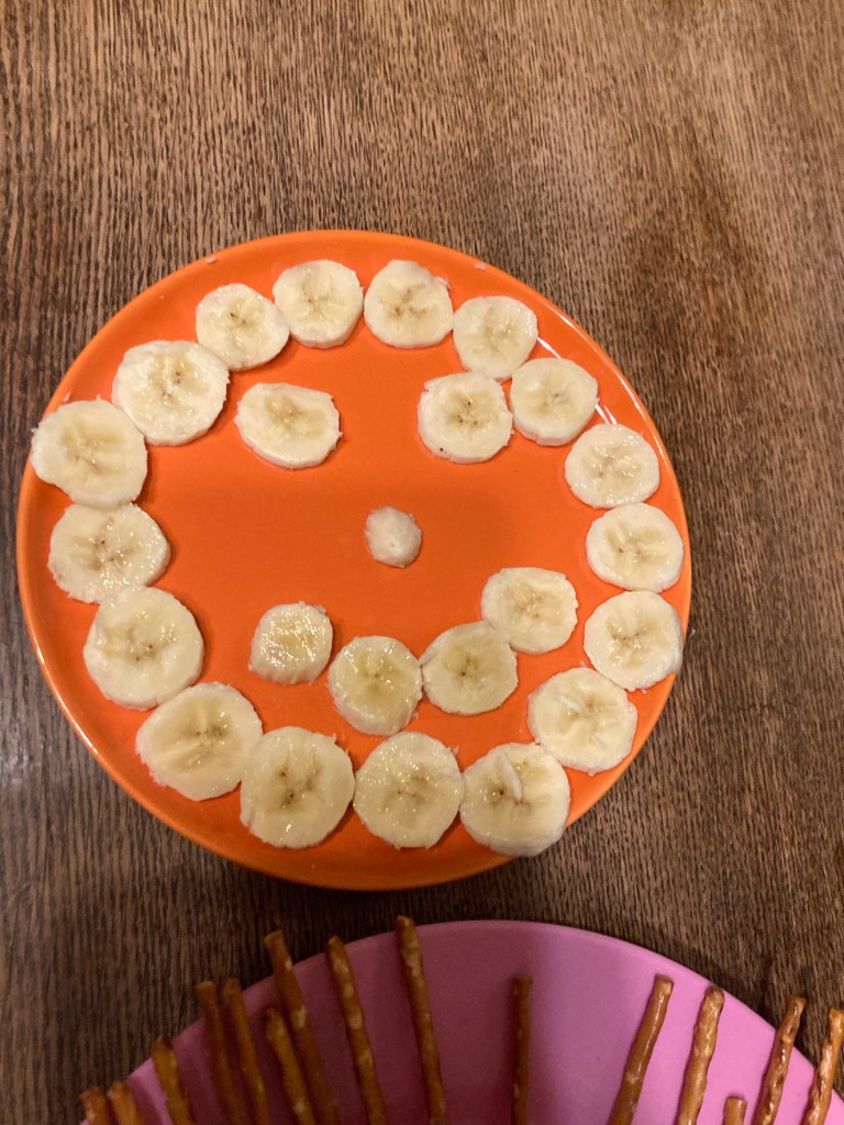 [KM:] „Ich mache jetzt einen Snack für die Hamburger, wenn sie kommen. Ameisen am Stiel. Und Bananen.“