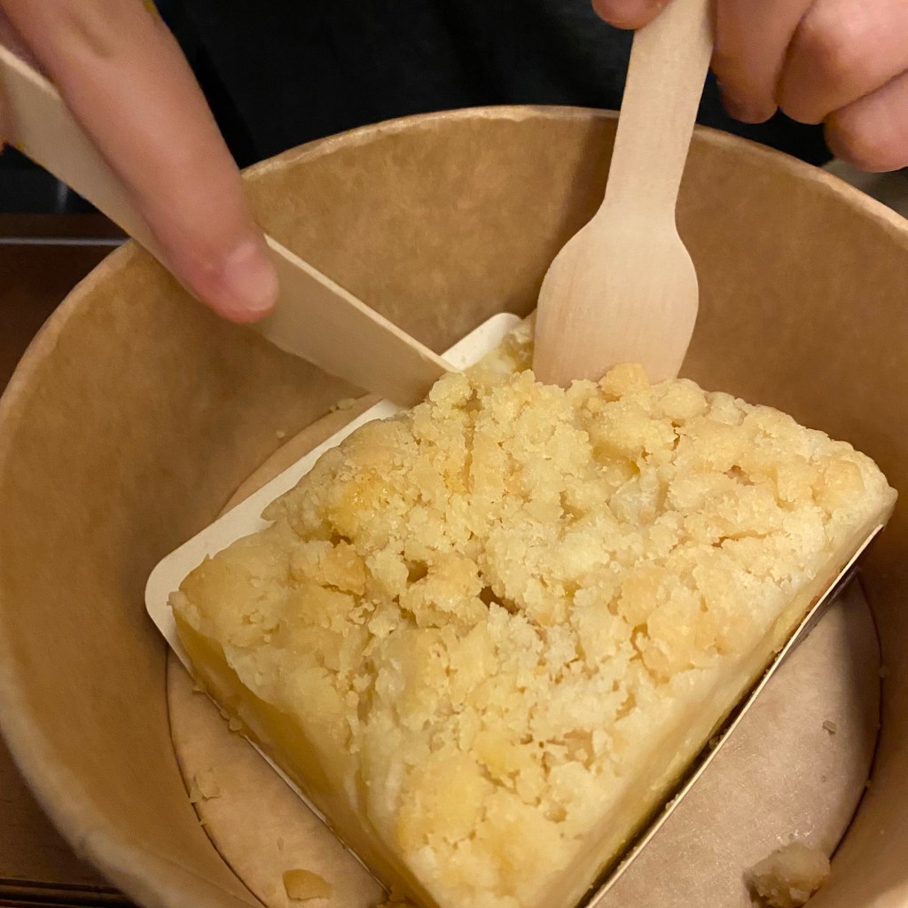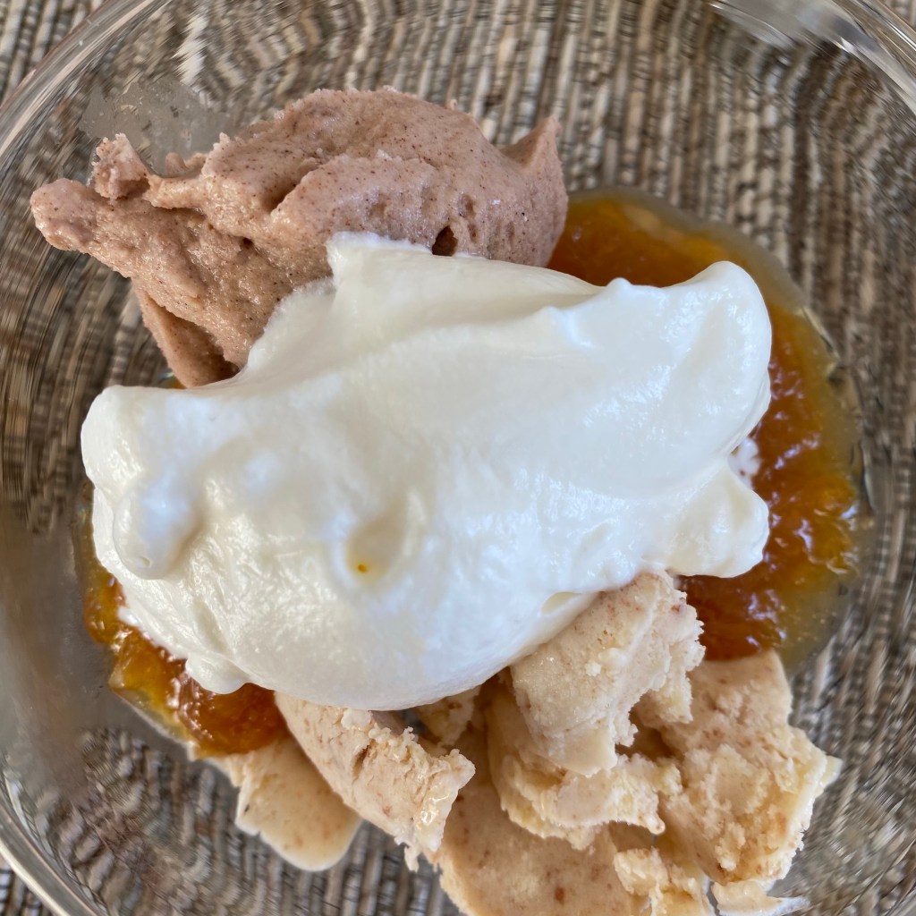 [GJ:] „Und gleich vom Nachtisch! Mit unserem selbstgemachten Zimteis!“