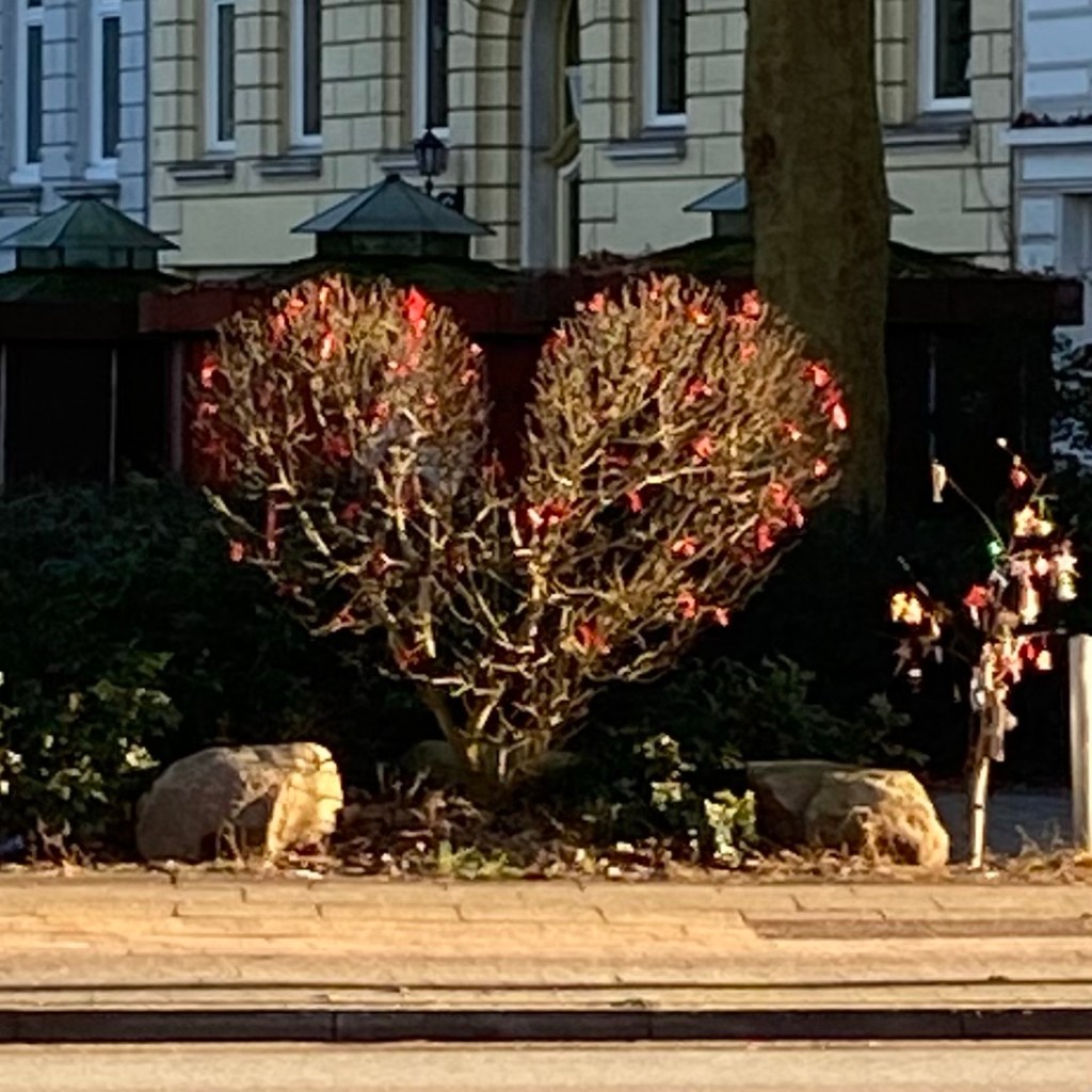 [kneteeis:] „Ach, und guckt mal da drüben! Da hat jemand den Busch in Herzform geschnitten und dekoriert!“