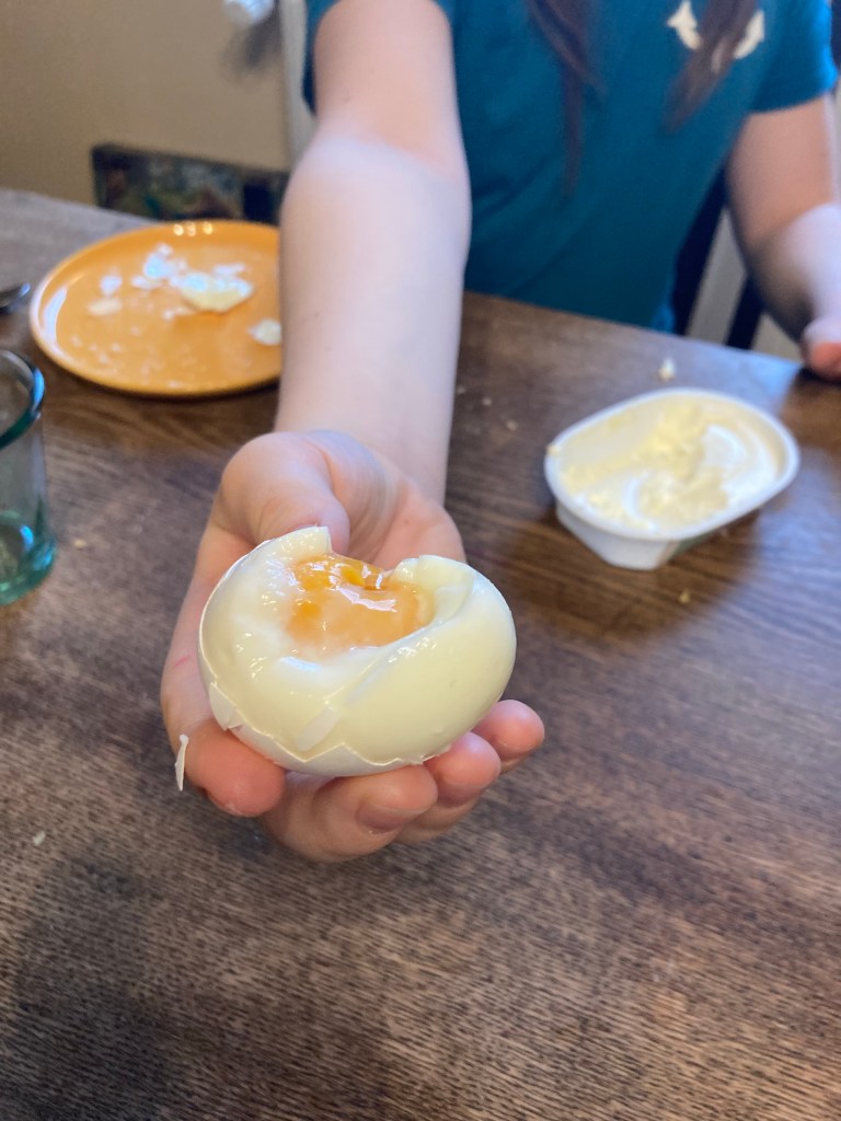 [KM:] „Haha, guckt mal, mein Ei ist das Jesuskind! Das Weiße ist die Krippe und das Gelbe ist das Jesuskind!“