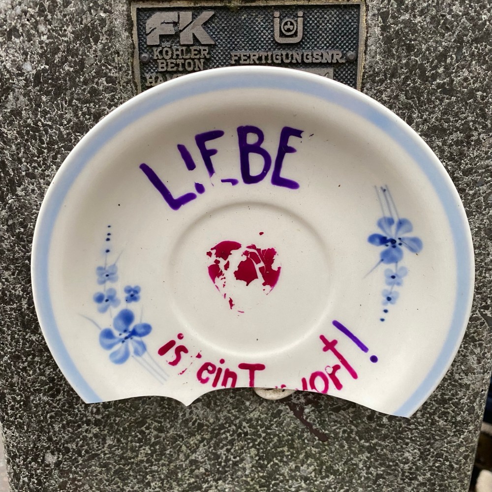[Kurz darauf. kneteeis:] „Ach, guck‘ mal: Hier hat jemand etwas von einem Teller abgeschlagen. Da steht jetzt: ‚Liebe ist ein Tort‘. Auch interessant…“