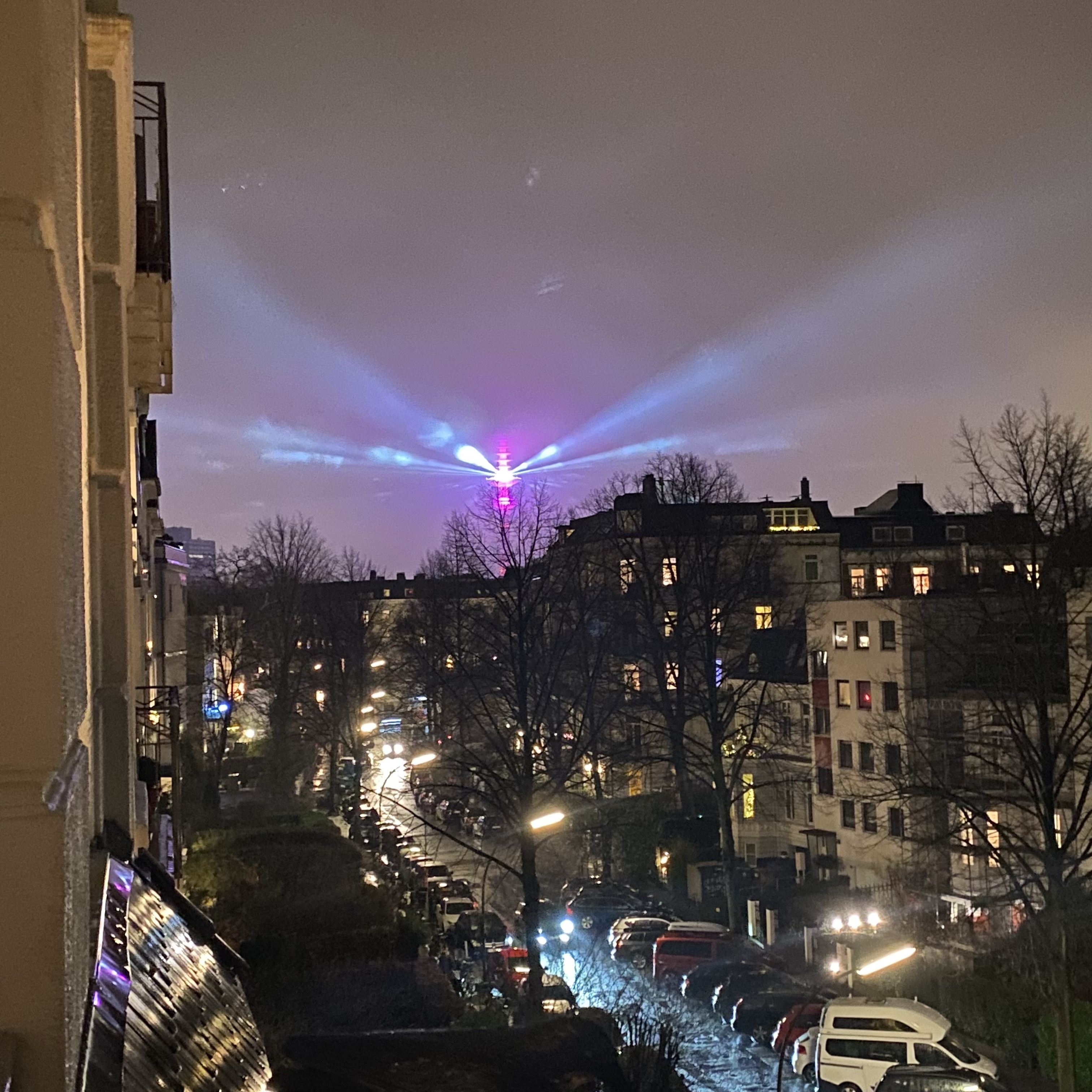 [Etwas später. kneteeis:] „Ach, guck‘ mal: Der Fernsehturm ist wieder erleuchtet. Ob der die ganze Nacht lang pink bleibt?“