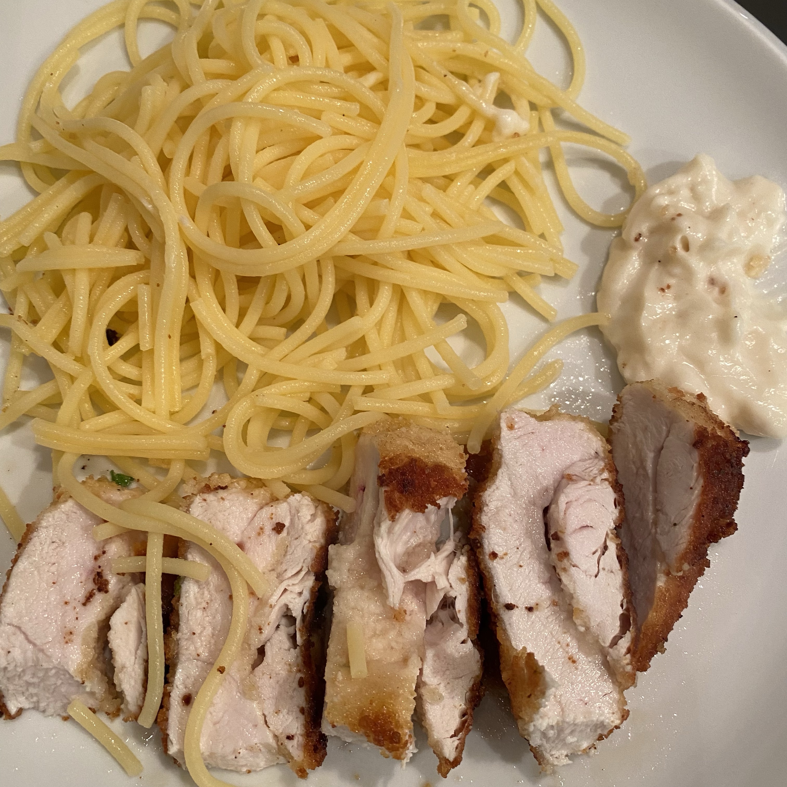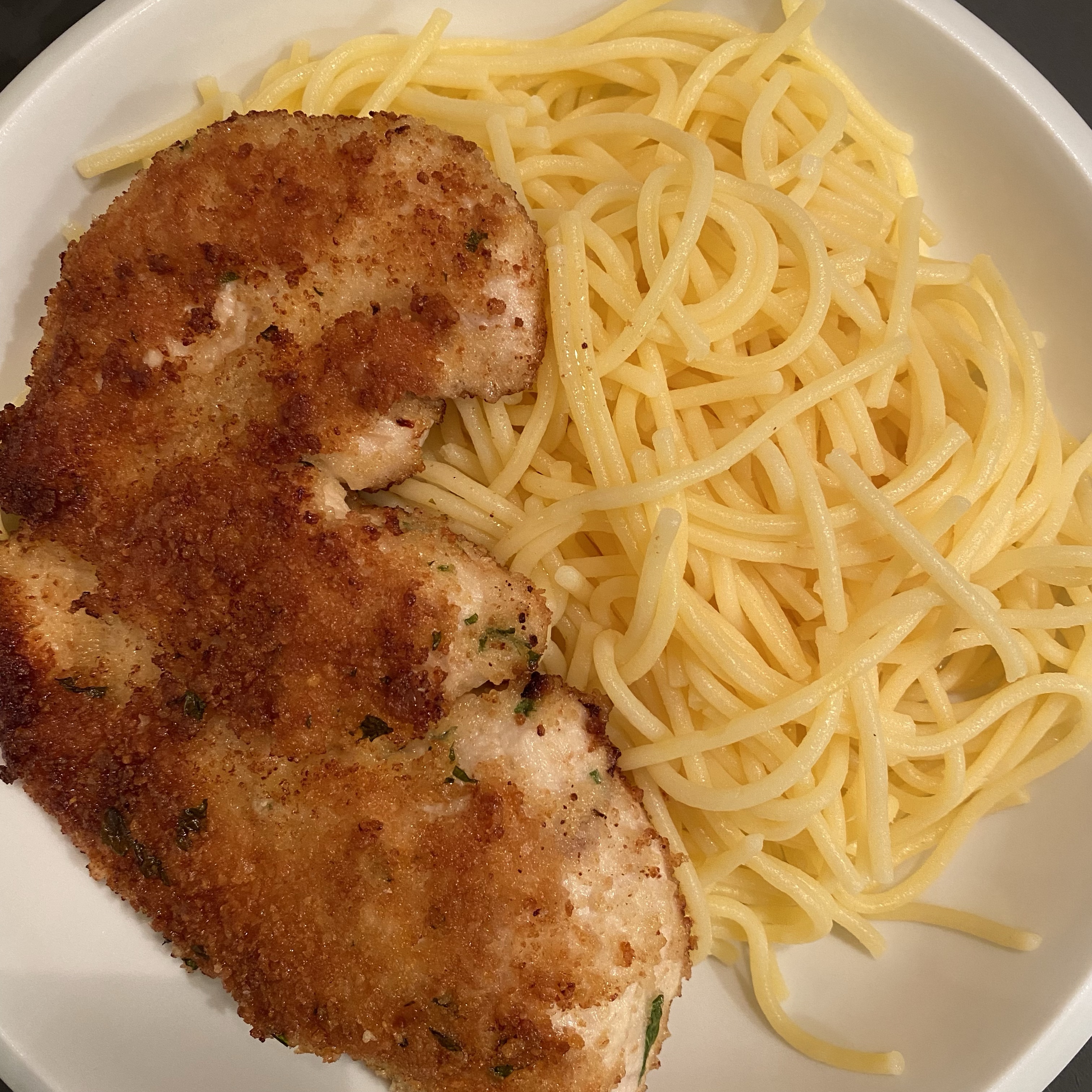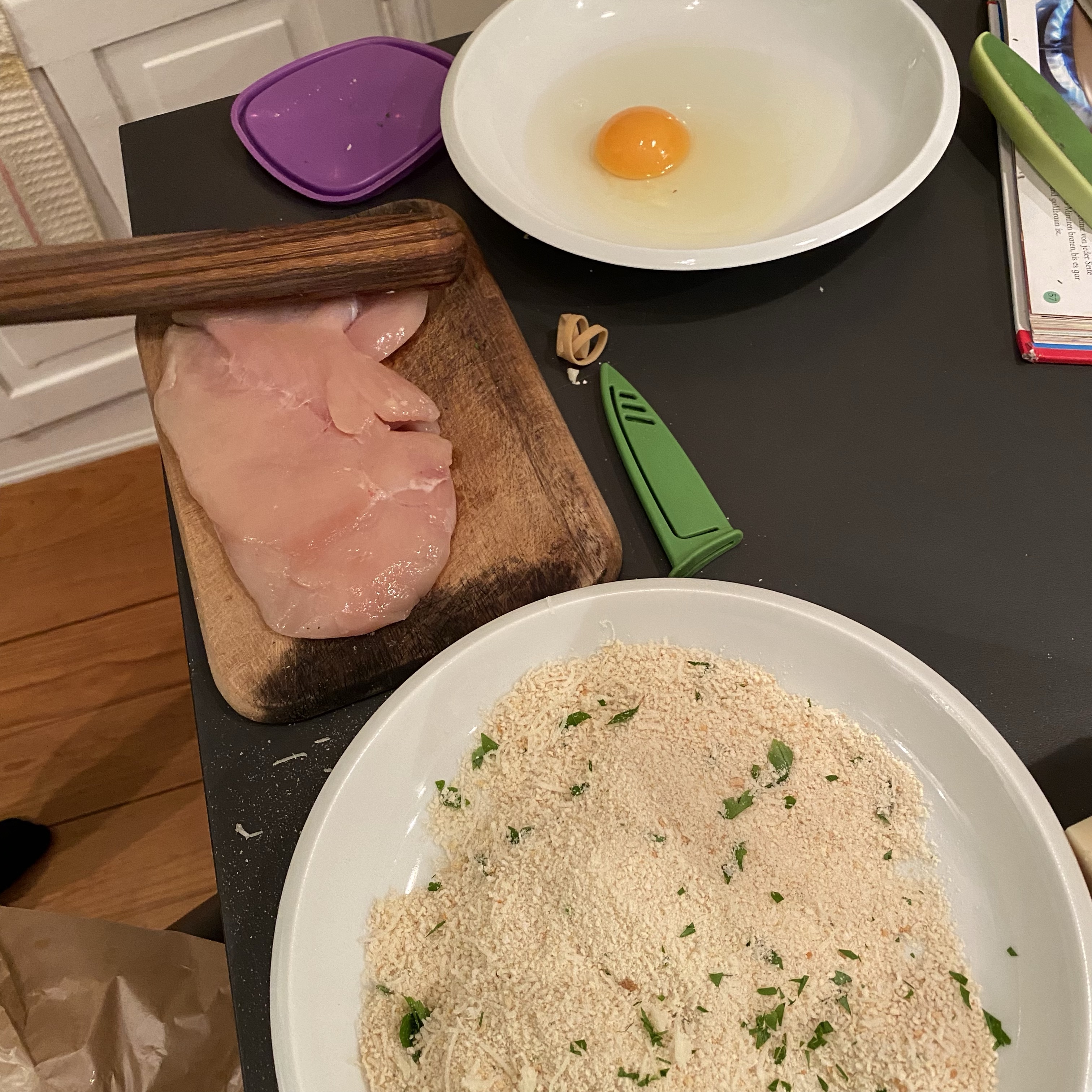 [GJ:] „Jetzt mache ich noch die Hähnchenschnitzel.“